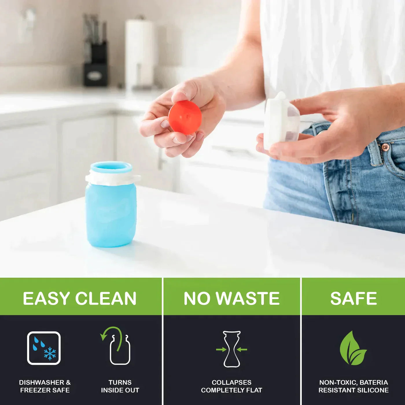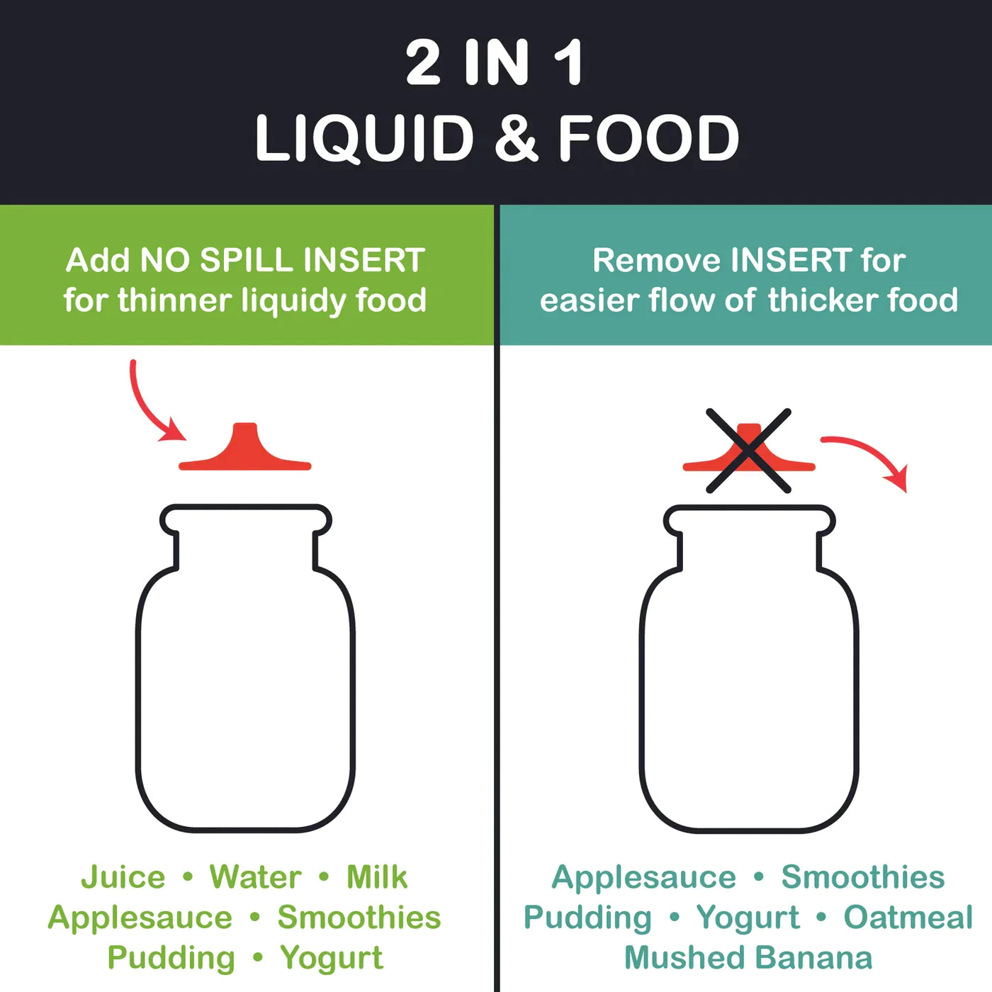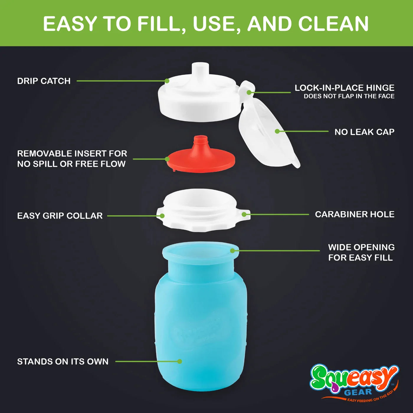 The Squeasy Snacker™ is the most versatile reusable food pouch on the market. Parents designed it for parents to provide easy feeding on-the-go™. It is the only food pouch that offers the patent-pending 2-in-1 removable NO SPILL INSERT™ for no spill or free flow. It not only works great for purees, smoothies, applesauce, yogurt, pudding, etc., but it also prevents spills when serving water and juice, unlike other food pouches. Easy to fill: Features a wide opening. The collar and spout are easy to grip for opening and closing. Easy to use: Simply fill with delicious blends of freshly pureed food, applesauce, yogurt, water or juice, etc. Easy to clean: The bottle can be turned inside out and all parts are top-rack dishwasher safe.