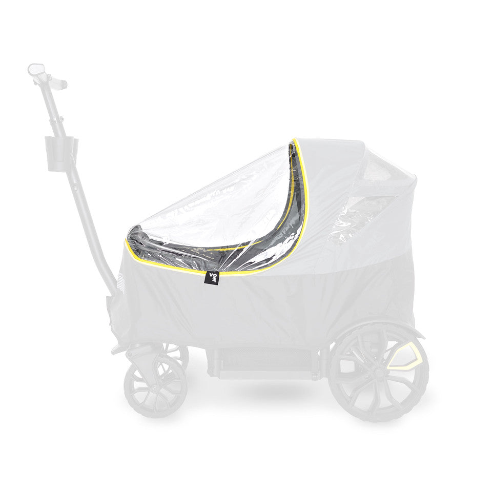 We know that even in the rain the adventure continues. We’ve been asked for a weather cover since the very beginning, and to be honest, we’ve been trying to get it right for awhile. We wanted to make sure the kids were entirely protected from water and snow, even when splashing upward from the road. We wanted it be usable with existing gear, like with one or two canopies in place. We wanted it to be lightweight (who wants a bulky rain cover to deal with during a rain storm?), and easy to fold up and store, since weather changes often. We wanted it to provide for maximum views for the kids, so no one felt like they were trapped in a cave. And we didn’t want the clear material to have an off odor or haze over time, like many clear materials do. All of these objectives conspired to make the design challenge more difficult than one would expect. At long last, meet the Veer Weather Cover!