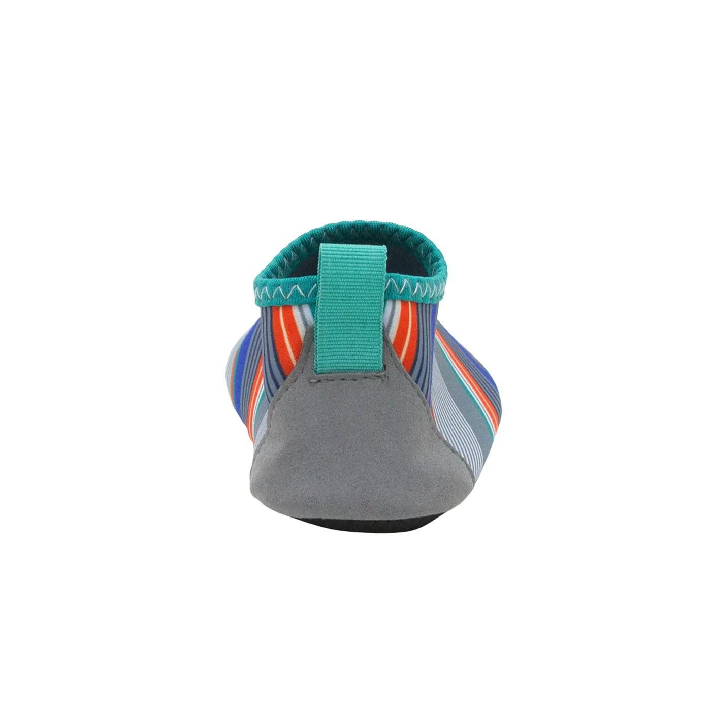Grey textile with multi stripe print. Easy on/stay on functionality with flexible, cushioned insole & thin rubber insert outsole.