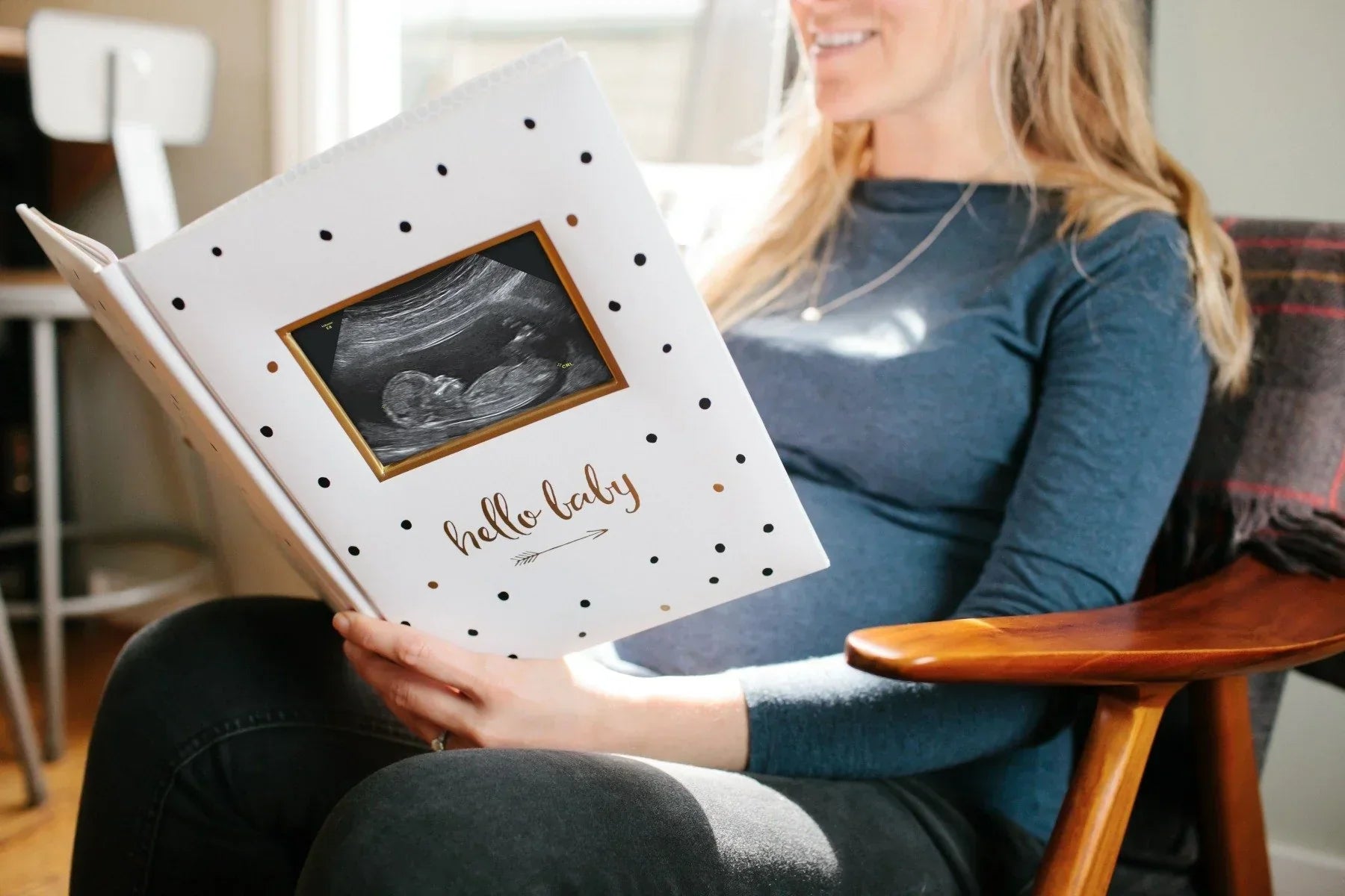 Display baby's sonogram photo on the front cover of this stylish baby book. White, black, and gold foil colors decorate the front of this baby book with “hello baby” and a modern arrow design stamped in gold foil.
