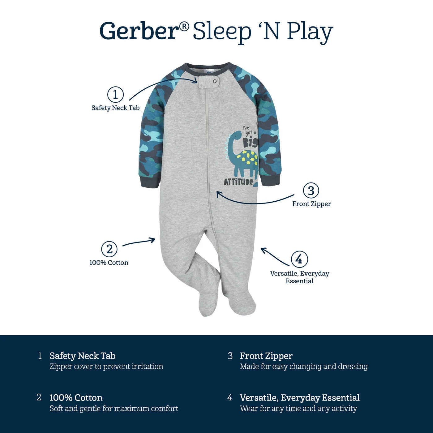 Our Sleep ‘N Plays are comfy, versatile, and adorable! Each one is designed for easy dressing and all-day comfort, perfect for babies and newborns. We use STANDARD 100 by OEKO-TEX® certification on products tested in an independent laboratory against a list of more than 400 harmful substances, including PFAS. This pack includes one baby boy Sleep ‘n Play with gray dino art.