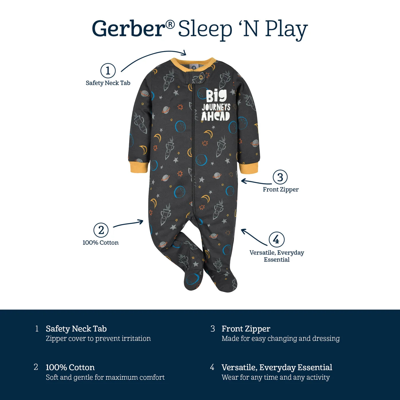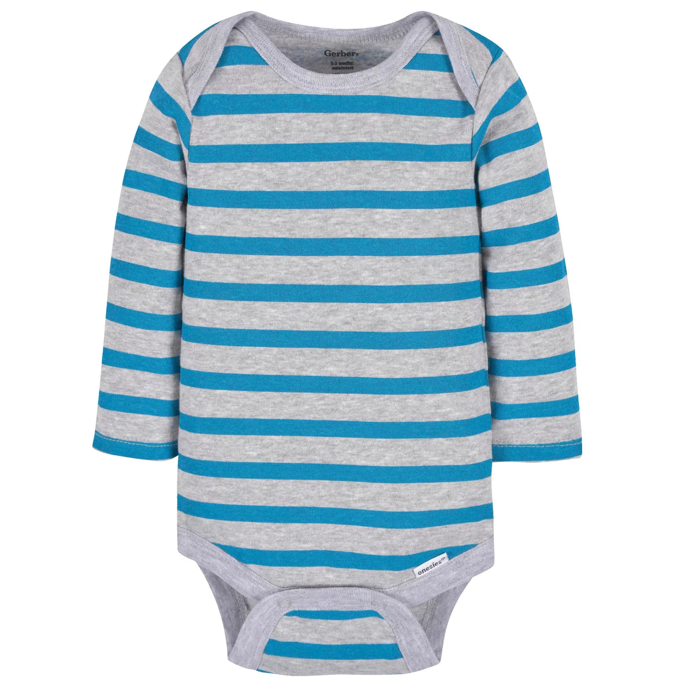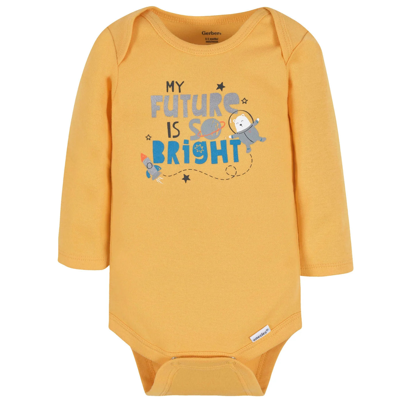 Our 3-pack Onesies® bodysuits feature long sleeves and expandable lap shoulder necklines. Each one is perfect for layering in cool weather and are made with soft cotton rib. We use STANDARD 100 by OEKO-TEX® certification on products tested in an independent laboratory against a list of more than 400 harmful substances, including PFAS. This pack includes three baby boy bodysuits in yellow and blue with space art.