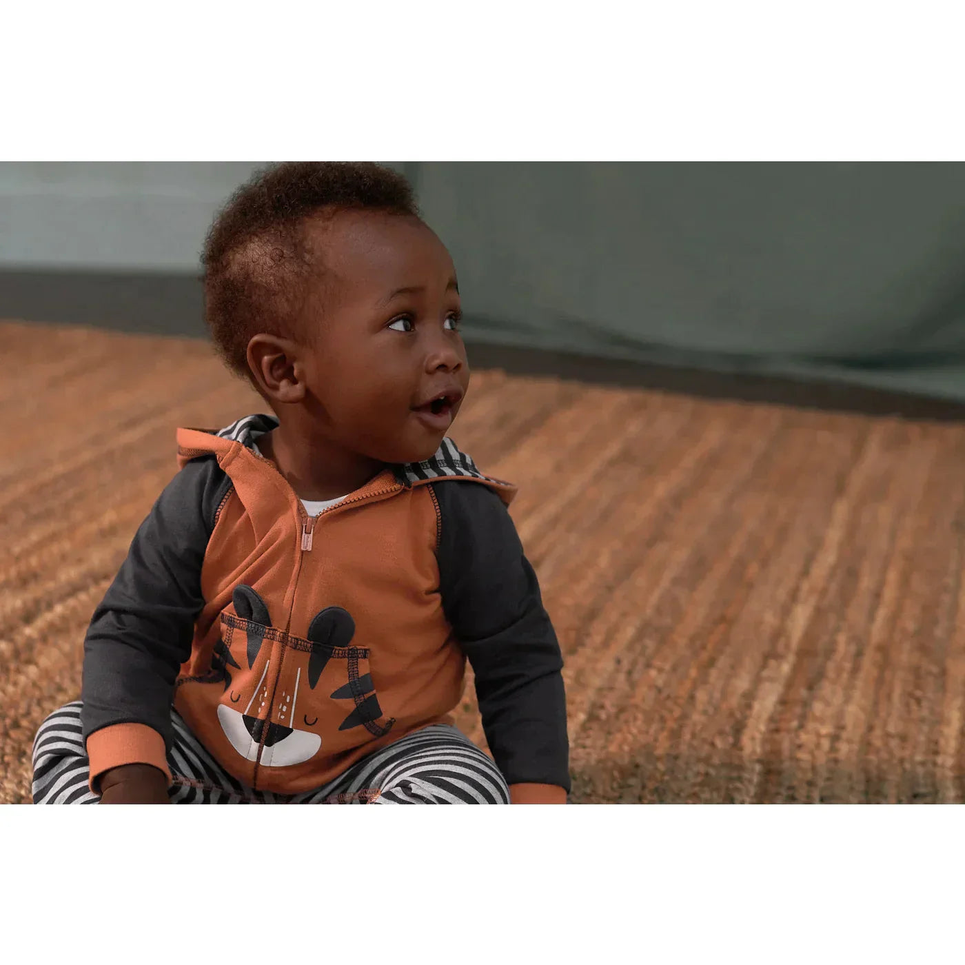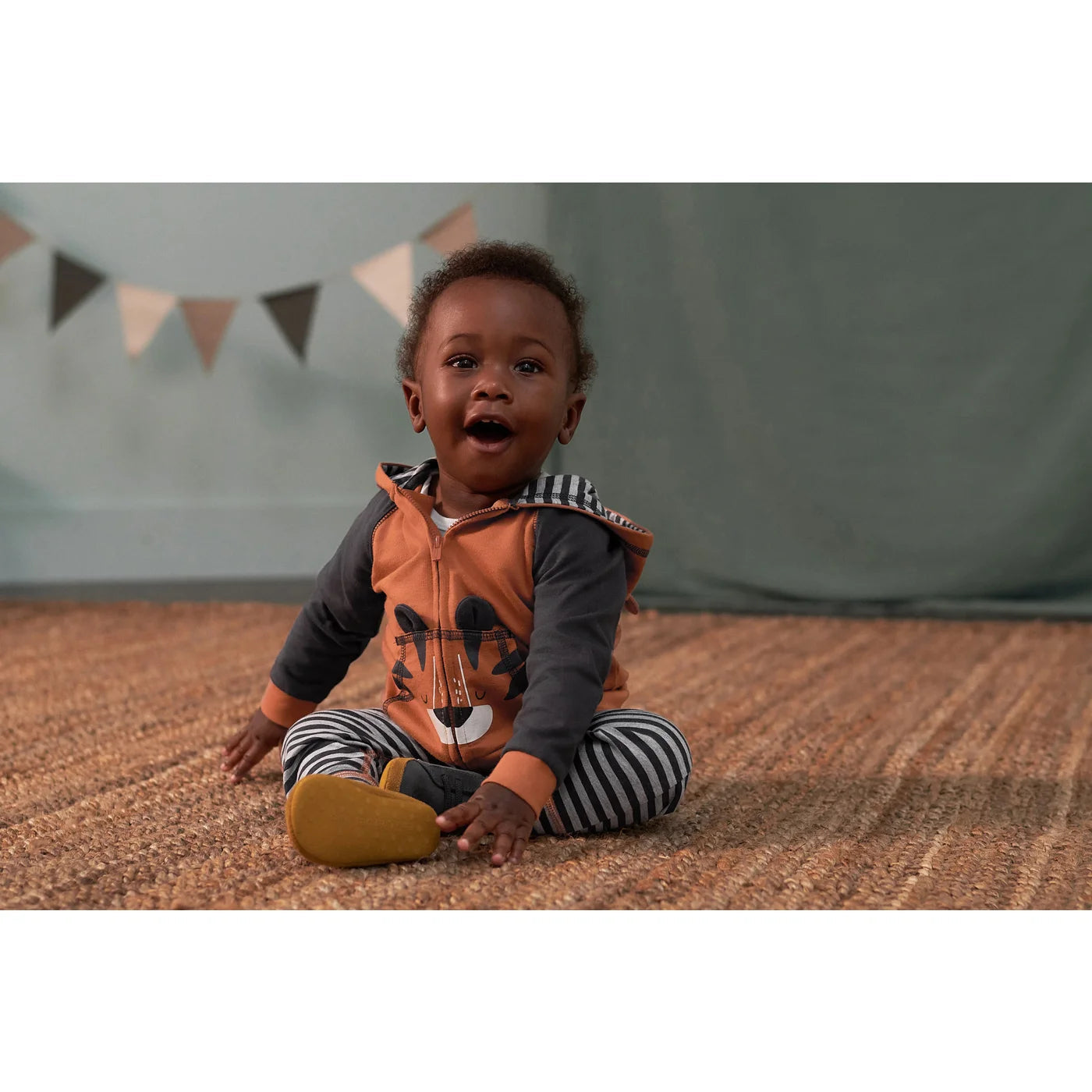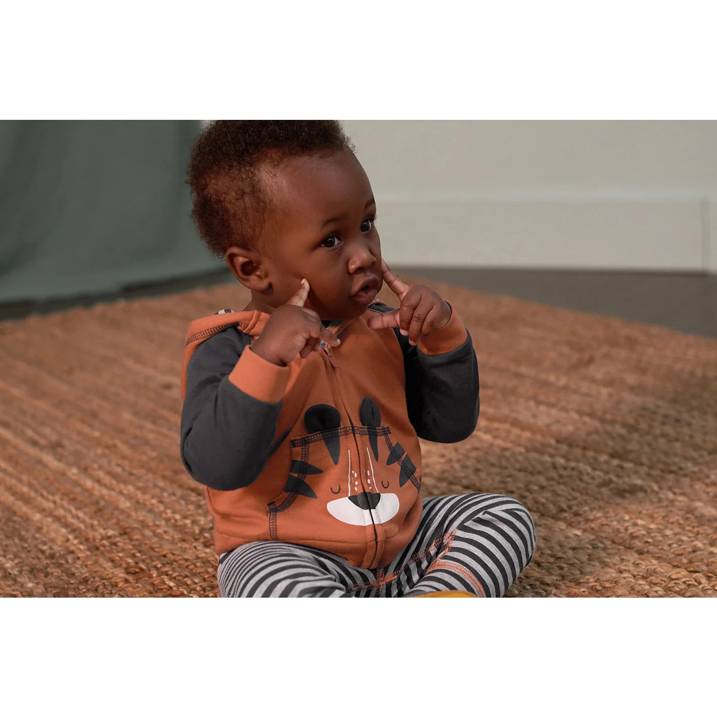 Our baby boy terry outfits are perfect for layering in cool weather. Made with soft and gentle fabrics, each piece is designed for all-day comfort. We use STANDARD 100 by OEKO-TEX® certification on products tested in an independent laboratory against a list of more than 400 harmful substances, including PFAS. This set includes one tiger hoodie and pair of joggers in orange.