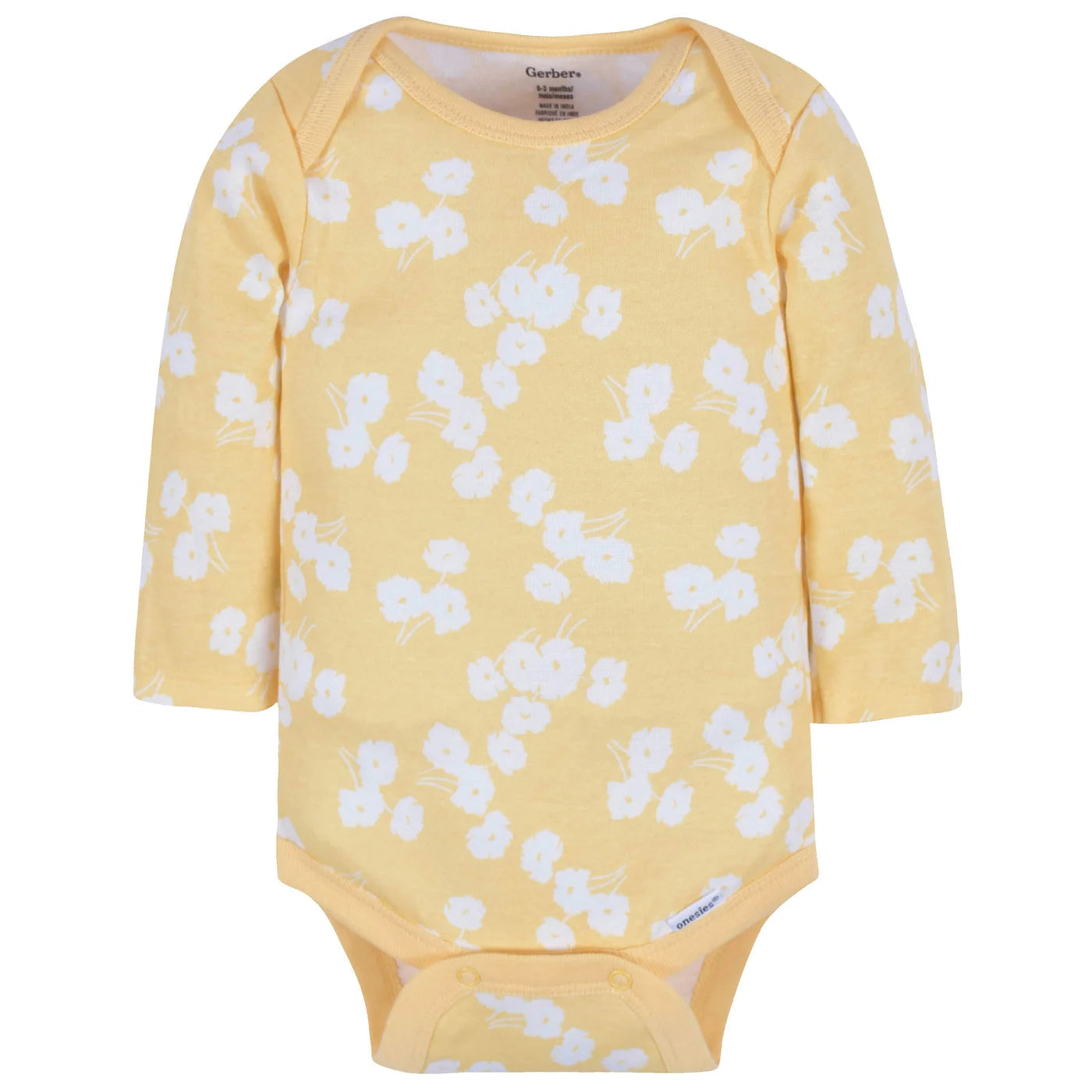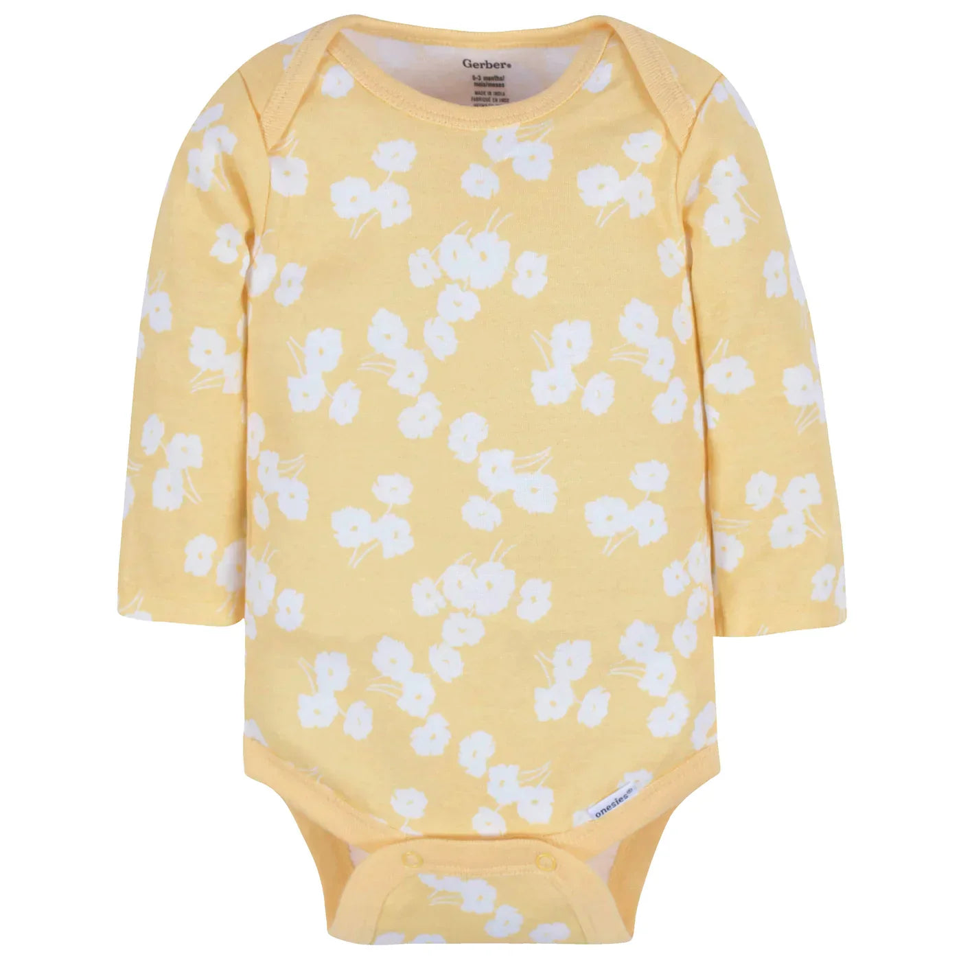 Our 3-pack Onesies® bodysuits feature long sleeves and expandable lap shoulder necklines. Each one is perfect for layering in cool weather and are made with soft cotton rib. We use STANDARD 100 by OEKO-TEX® certification on products tested in an independent laboratory against a list of more than 400 harmful substances, including PFAS. This pack includes three baby girl bodysuits in yellow and white with floral art.