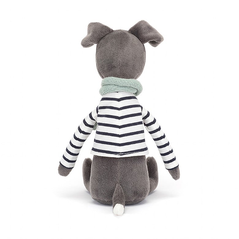 Wearing a dashing minty knit scarf, this wandering whippet is a hound about town!