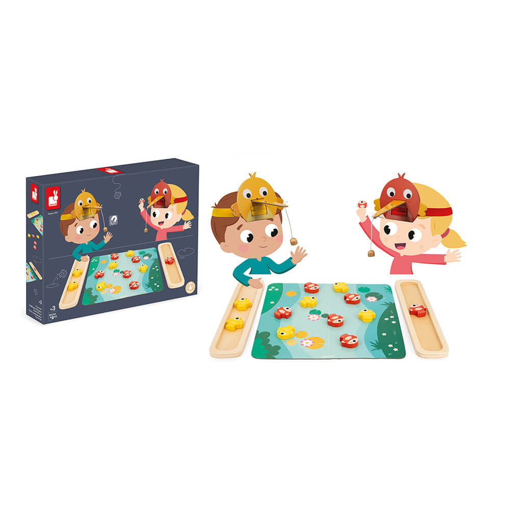A fishing game like no other! Help your bird catch the most fish in this fun skill game. 12 fish are swimming peacefully in the river, when suddenly 2 hungry birds race to catch them all before the time runs out! Everyone places their bird on their head using the elastic bands, you will then have to catch the fish using the magnet hanging under the bird's beak: concentration and precision are required! But pay attention to the timer, time is running out and you will have to be quick! Each player will have to catch the right colour fish in this magnetic board game, ideal for having a good time together at a party or on a rainy day. This game contains: 1 game board, 2 cardboard birds held in place by 2 elastic bands, 1 hourglass and 12 wooden fish. It is intended for children from 3 years old and will even entertain the adults! For 2 players.
