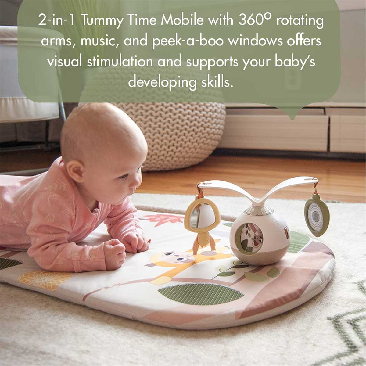 Playing gives babies an excellent opportunity to understand the idea of cause and effect. Let your growing baby enjoy playing with the Tummy Time Mobile in tapping mode. Your little one will gradually learn to tap the mobile and cause the audio and visual feedback, encouraging the understanding of cause and effect.