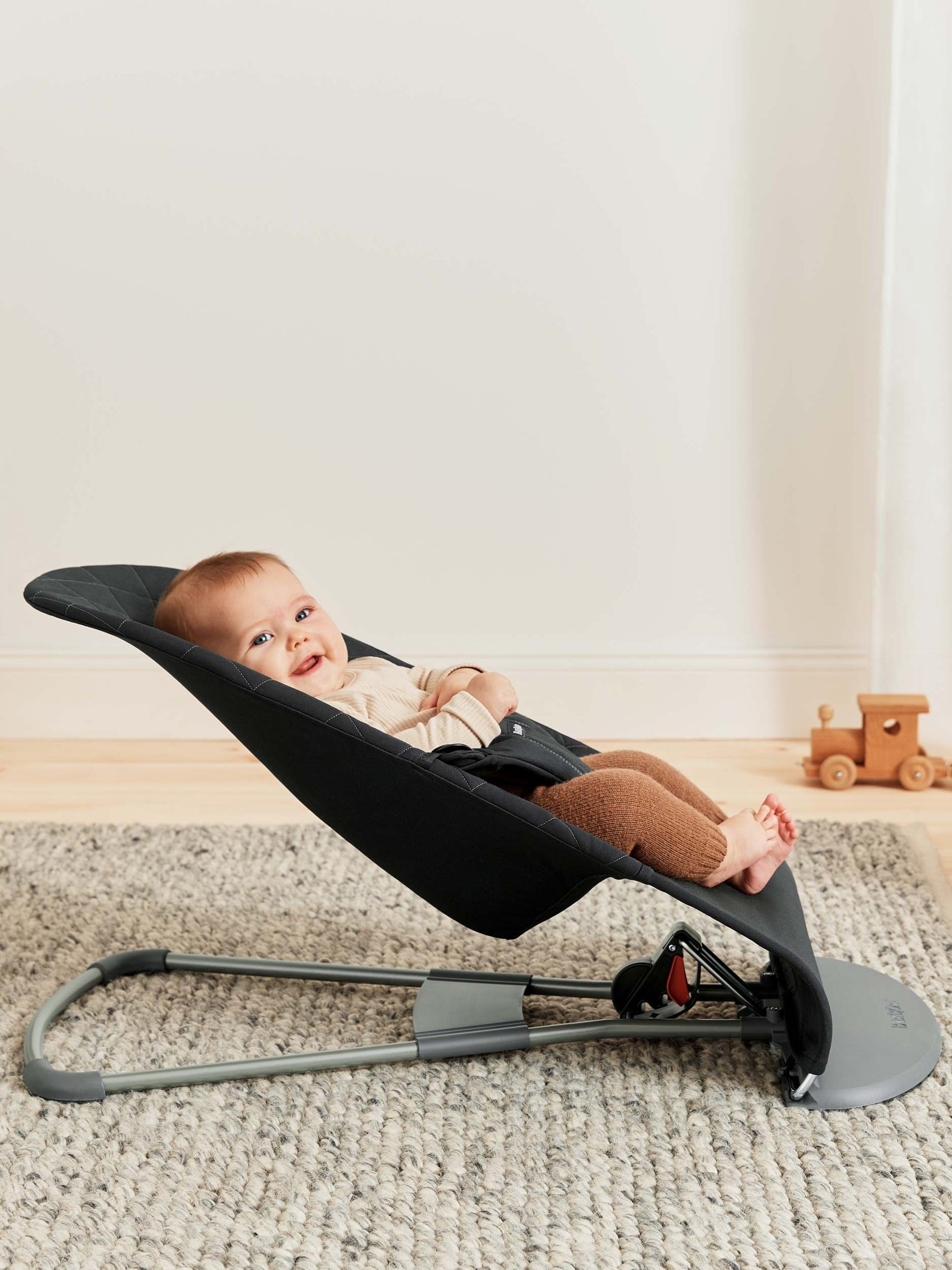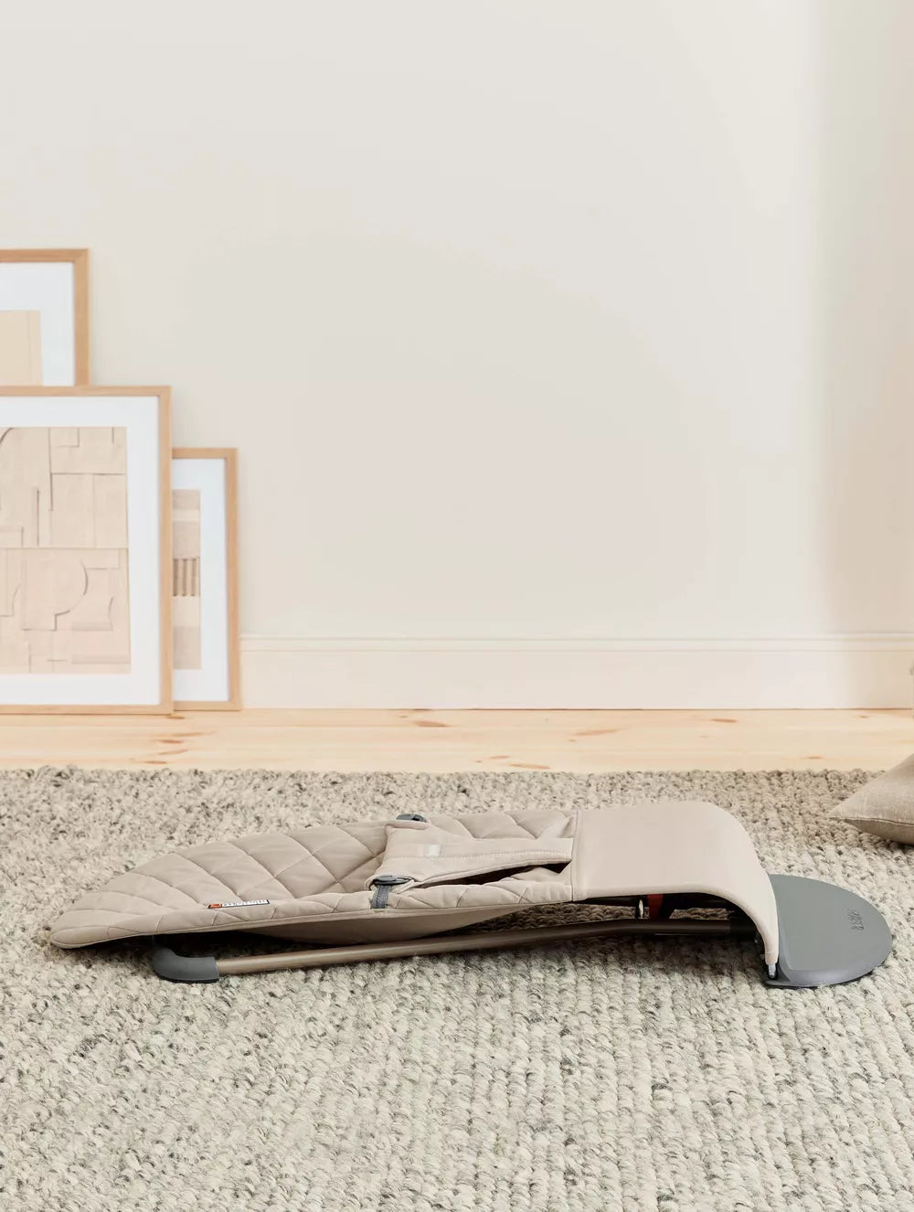 Bouncer Bliss is a lightweight and handy baby bouncer with a gray frame and a fabric seat in quilted cotton,