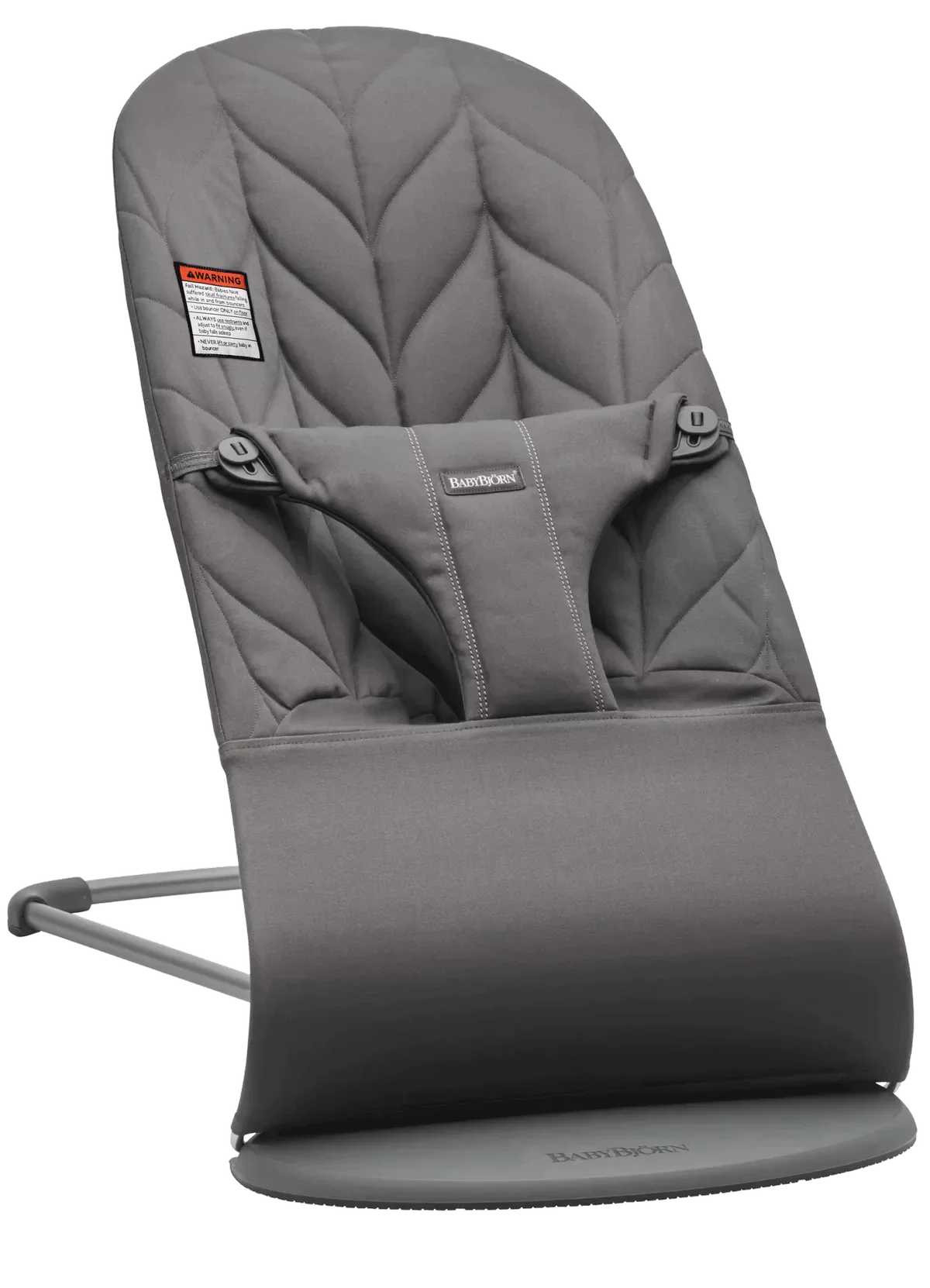 Bouncer Bliss is a lightweight and handy baby bouncer with a gray frame and a fabric seat in a cotton petal quilt.