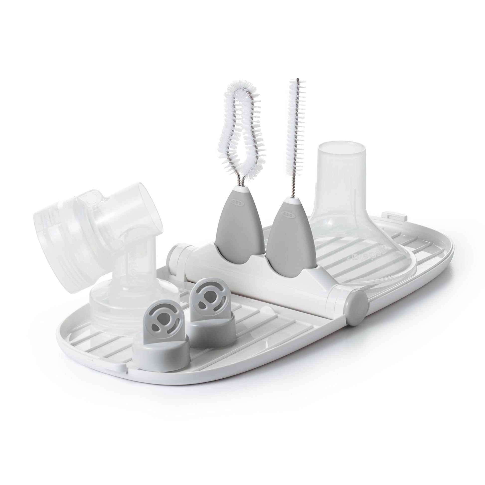The compact and thoughtfully designed OXO Tot Breast Pump Parts Drying Rack features elevated ridges and prongs to keep parts elevated above water for quick drying.