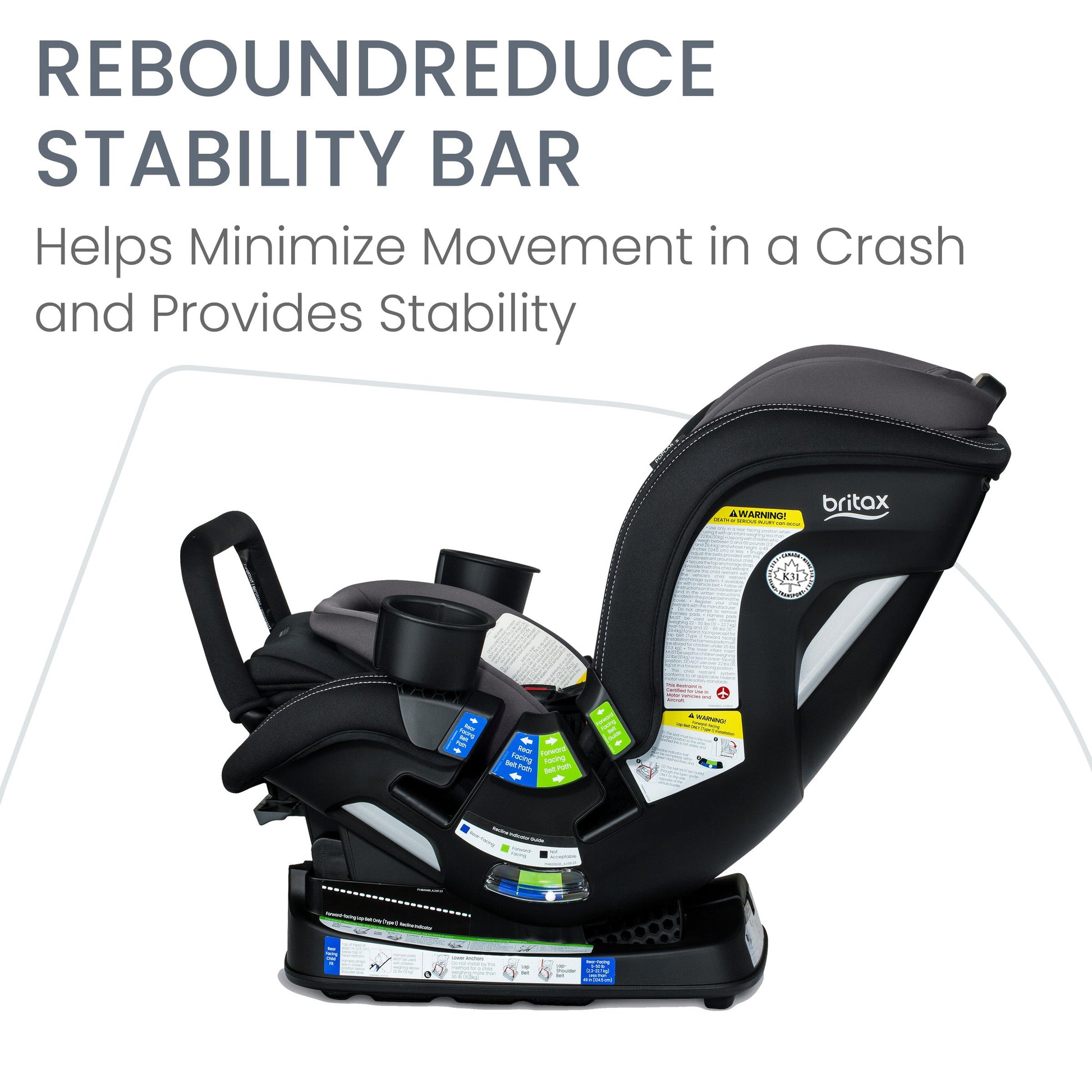 - ReboundReduce™ Stability Bar: Carbon steel bar easily attaches to the car seat when installed rear-facing to minimize movement in the event of a crash; must be removed when installed forward-facing