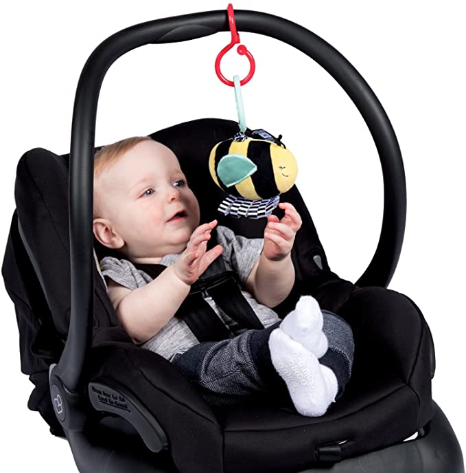 Jet, the bee themed travel toy features a crinkle paper wing, knotted string antennae and soft ribbon loop legs.