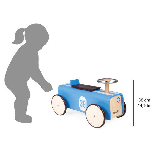 It must be said that he was destined for greatness. In terms of style, we love the rounded lines, the sporty touches provided by the number 39 detail, the two white stripes and the vintage look with the wood and metal steering wheel that allows the silent directional wheels to be steered!