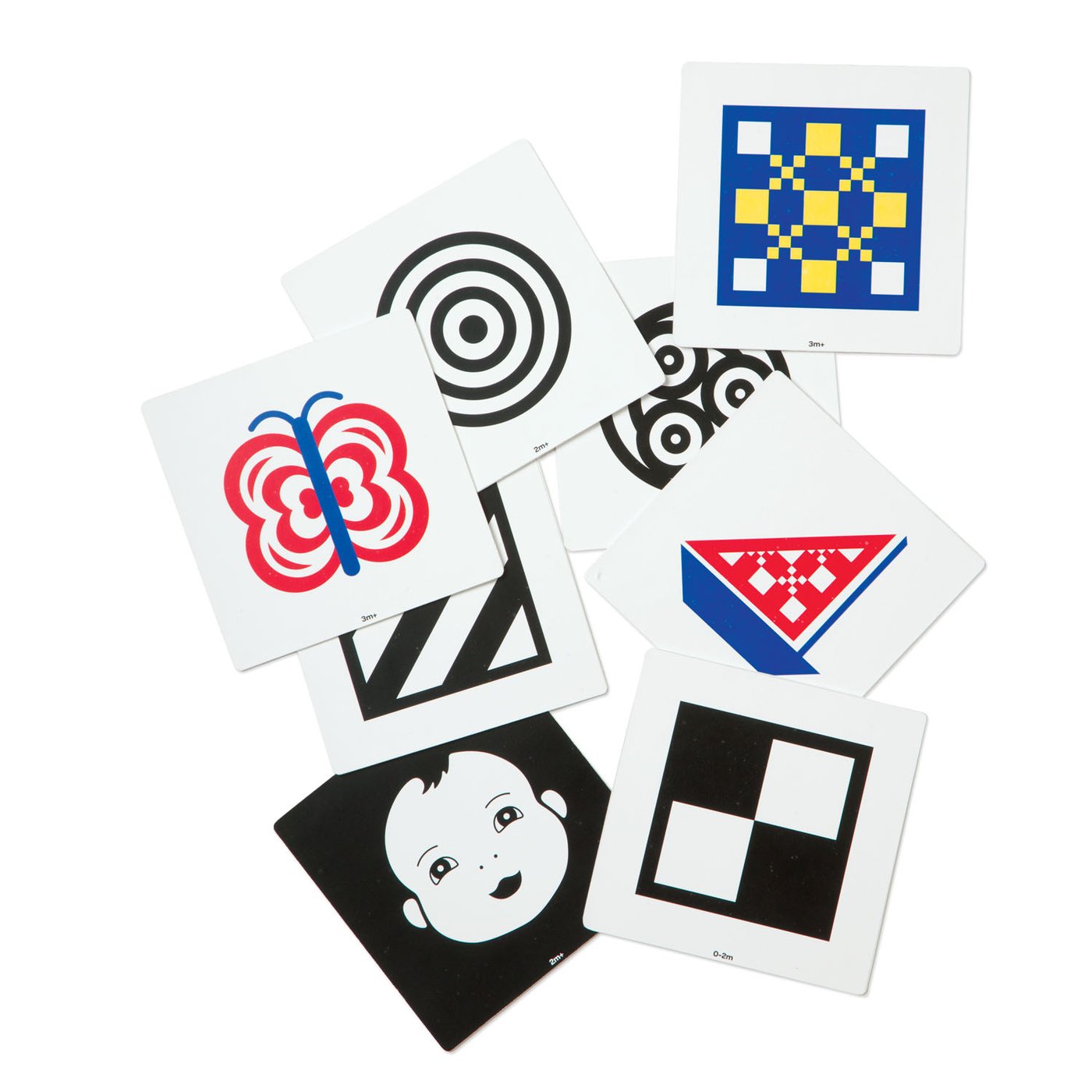 Ten interchangeable graphic cards offer a range of simple high-contrast images to more complex colored patterns and graphics to foster visual development.