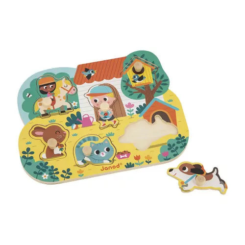 This peg version (small wooden elements on the pieces that allow the child to grasp them easily) is perfectly adapted to the development of babies.