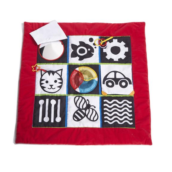 Flaps with reverse print graphics, various textures and crinkle paper will keep baby engaged.