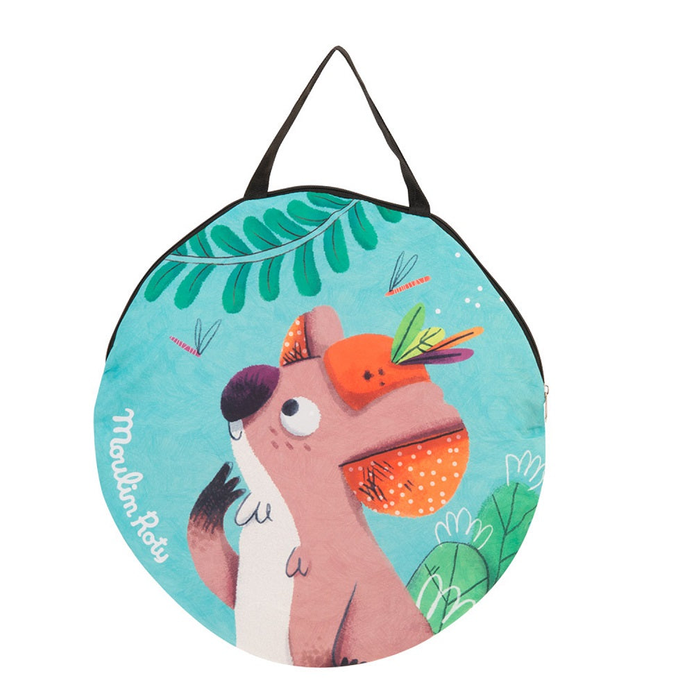 A children's hidey-hole with a door and window, illustrated with dancing jungle animals.