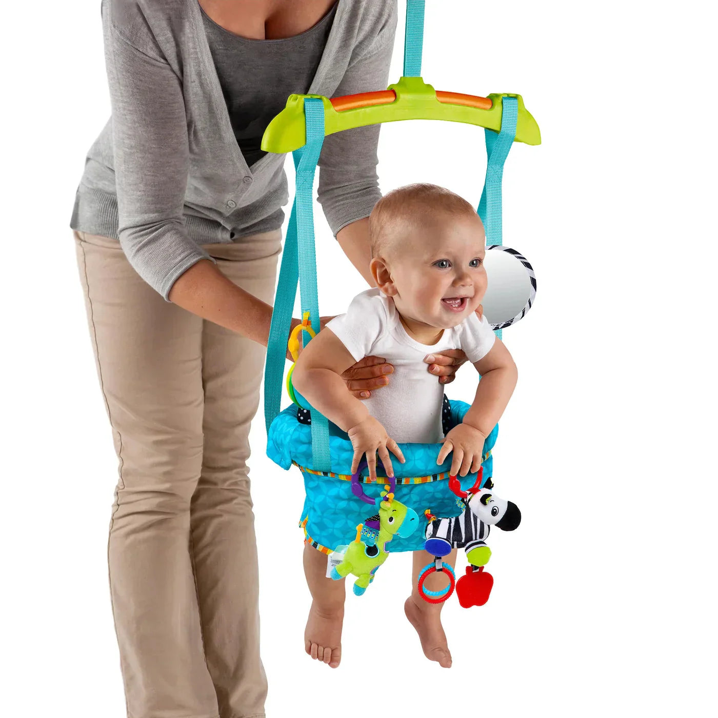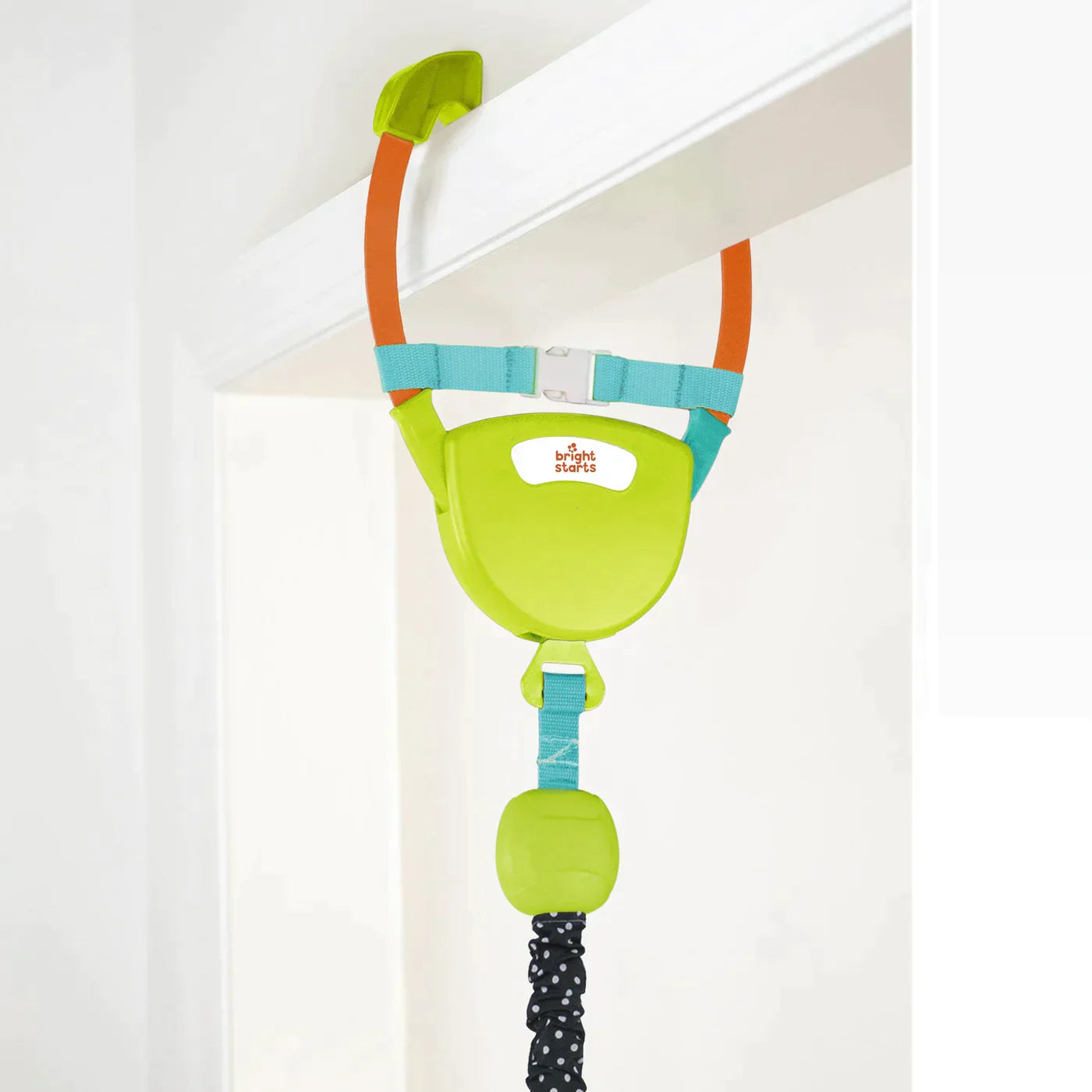 The Bright Starts™ Bounce 'n Spring Deluxe Door Jumper™ provides hours of bouncing fun for baby! The 4 playtime toys including a plush zebra and giraffe, teethers, and mirror, will entertain while baby jumps. The straps are adjustable for use as baby grows, and the soft prop pillow provides extra support for smaller babies. The light-weight frame makes transport easy. The seat pad is machine-washable.