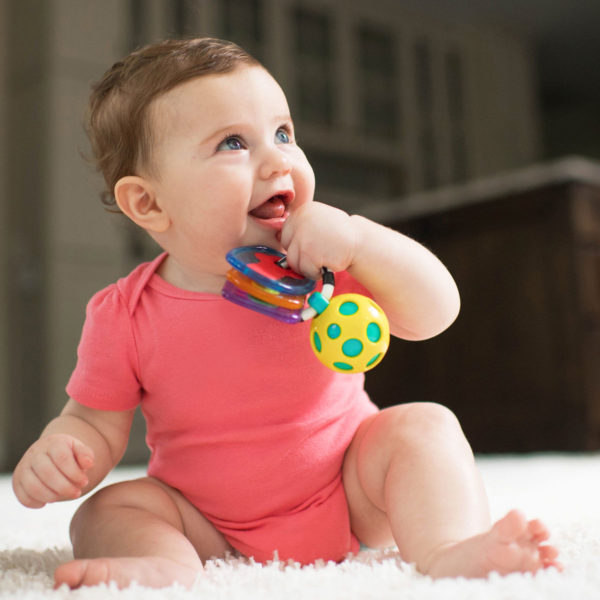The Drive & Drool Keys put baby in the driver’s seat! A rattling polka-dot ball makes for an engaging key chain and offers a fun rattling sound. The use of contrasting colors, different materials, and variety of surfaces help stimulate baby. The soft, squishy material is perfect for baby’s environment, and is dishwasher safe, too!