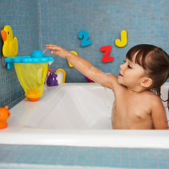 Games always make bath time more fun! So why not introduce Munchkin’s DuckDunk™ to your toddler™s bath game line-up? With a hoop that cinches to form into a net, and three colorful bath balls that squirt water when your child squeezes them, there are endless possibilities to stay engaged and have fun in the tub. One moment your tub can be a packed basketball stadium, with fans cheering your child on as they shoot, score and develop fine motor skills. Or your toddler can develop tactile skills as they search for and return Mother Duck’s three eggs to her nest before they hatch in the sudsy water. Whichever skill-building game you and your little one choose to play, your child will be entertained and quacking with laughter.