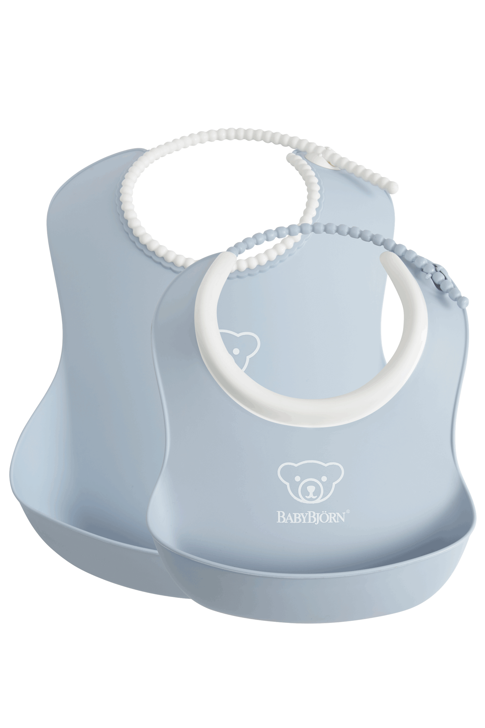 A smaller bib that best suits a baby aged 4–10 months and a larger bib that can be used from the age of approximately 4 months.
