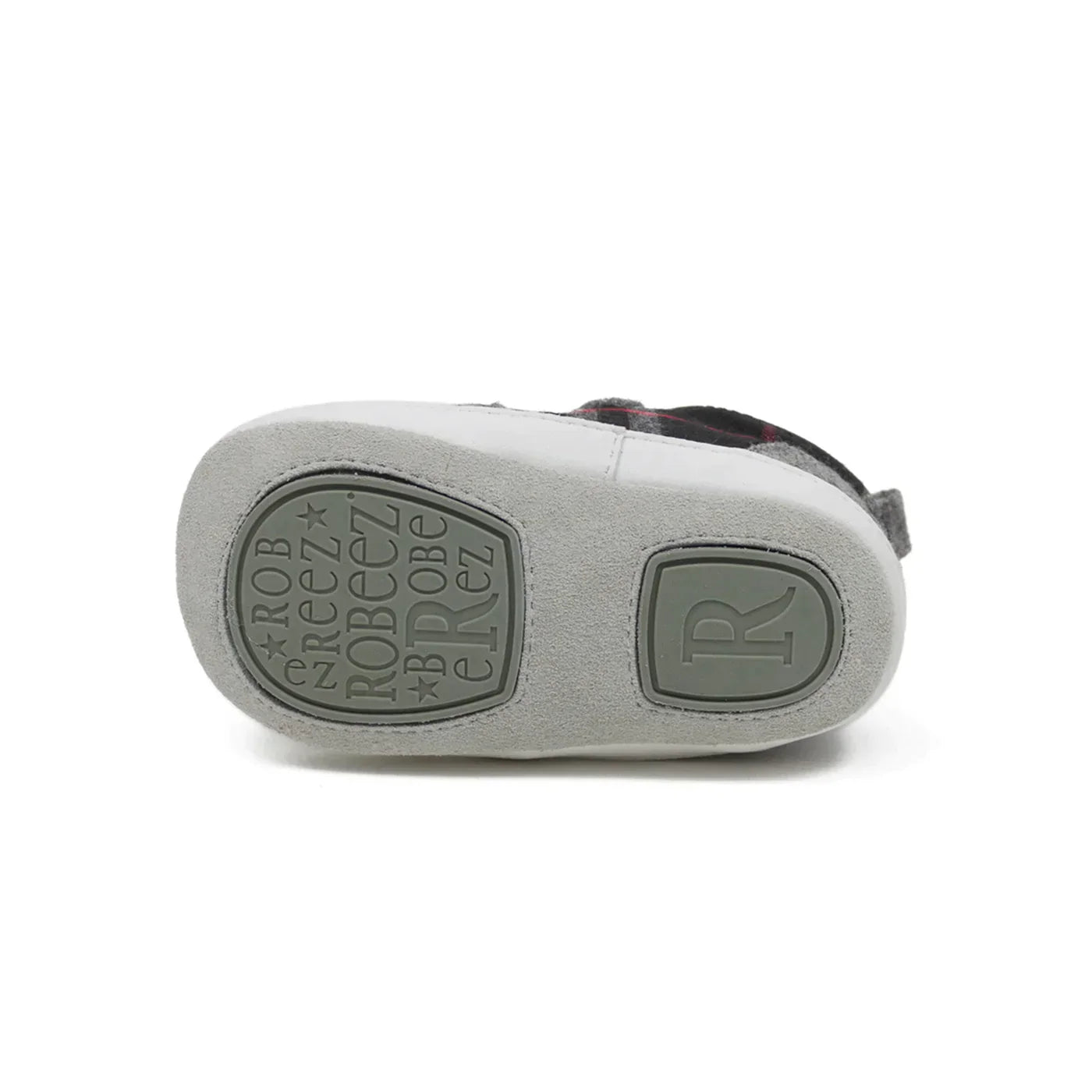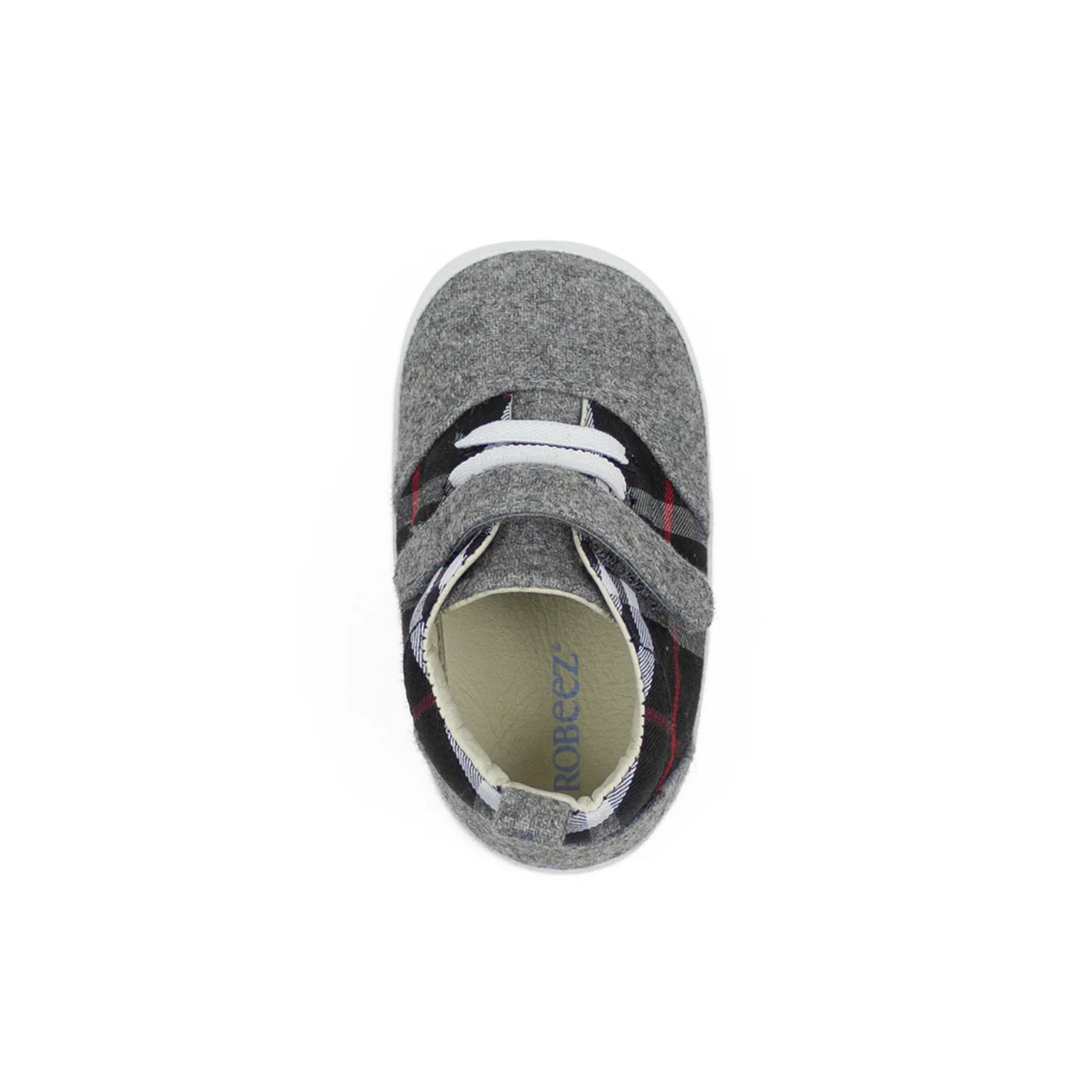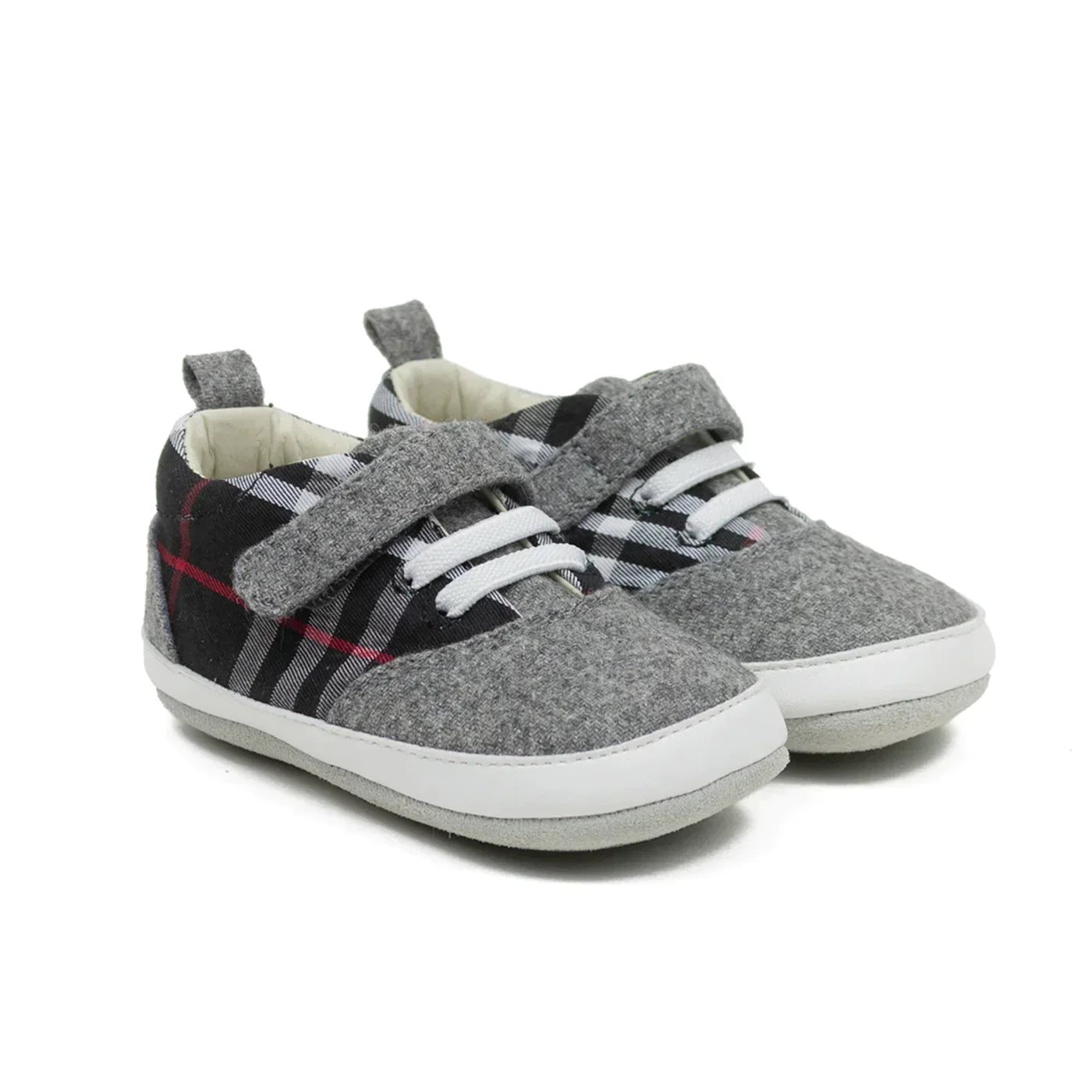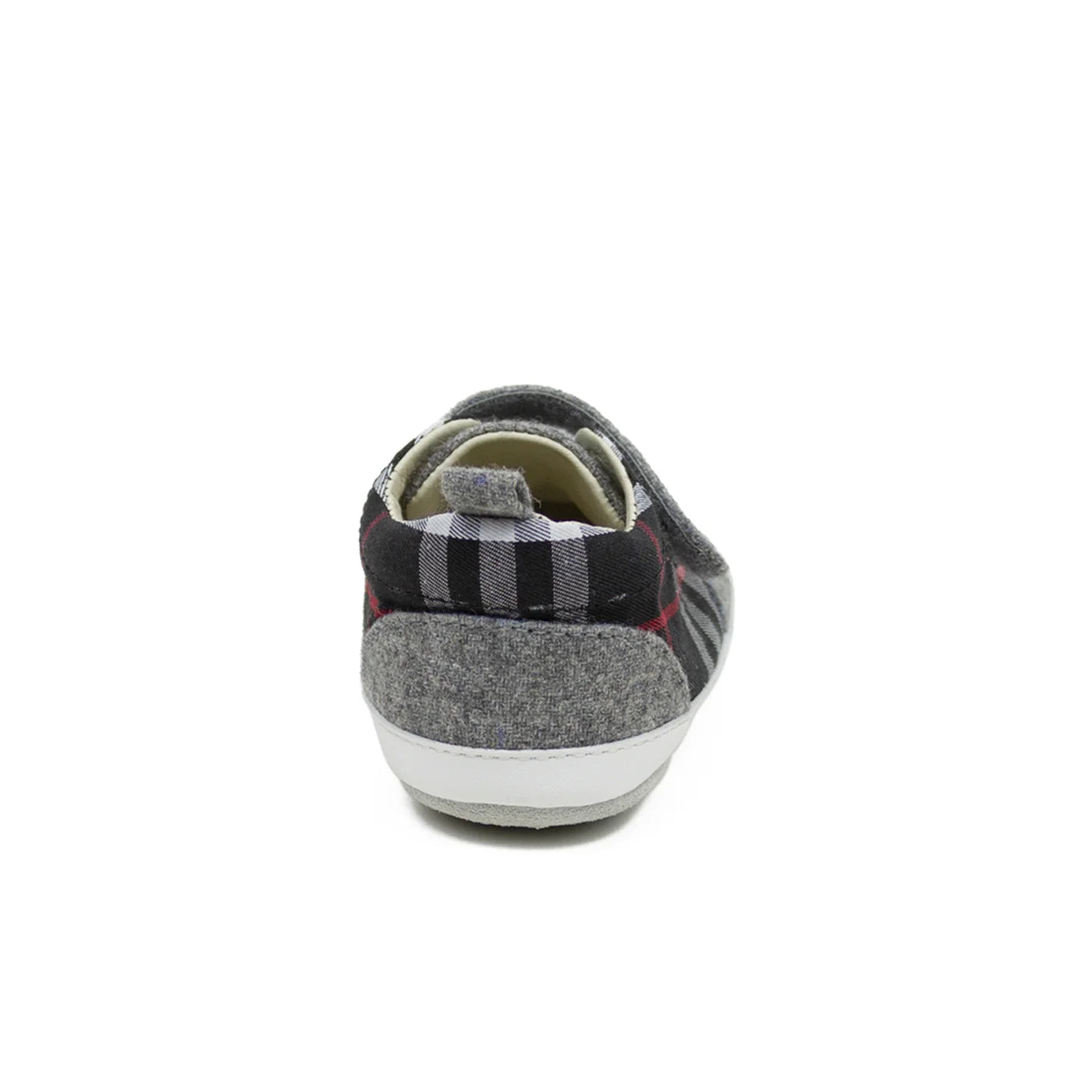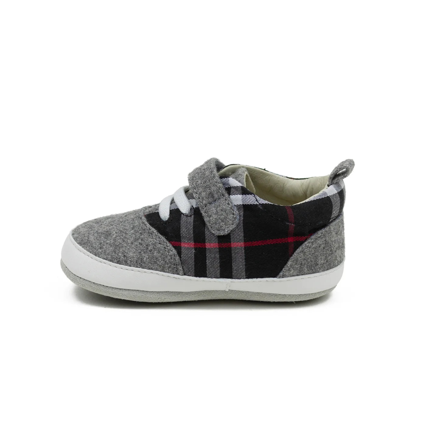 - Grey plaid wool ow top sneaker style with stretch lace, hook and loop strap closure