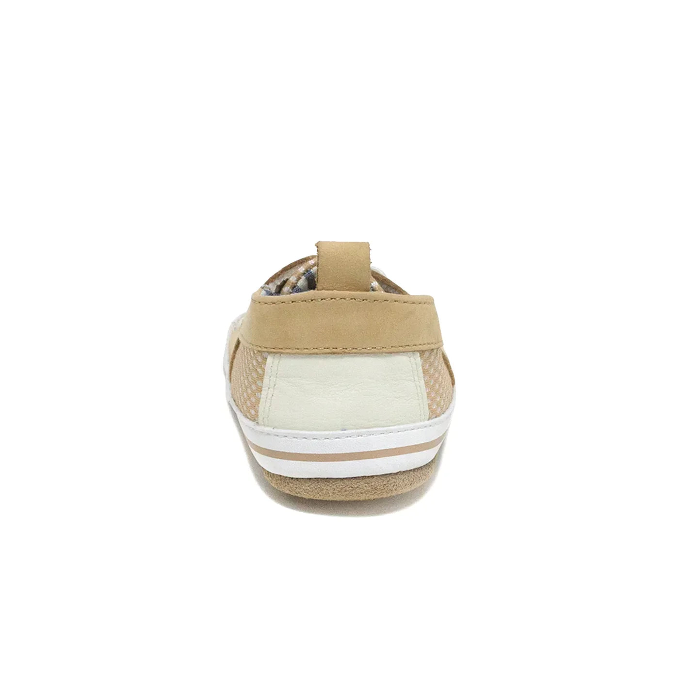 Tan leather and mesh boat shoe style, elastic gore strap closure and plaid lining. Easy on/stay on functionality with a flexible, cushioned insole & suede outsole to provide protection and comfort for healthy foot development.