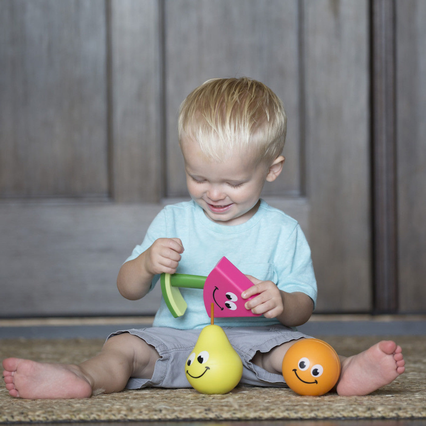 The orange comes apart into four thick slices that snap back together with magnets. The watermelon pieces stack atop a teeter-tottering peg base while silicone seeds fascinate the fingers.