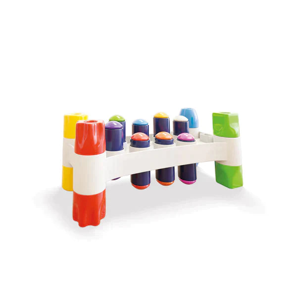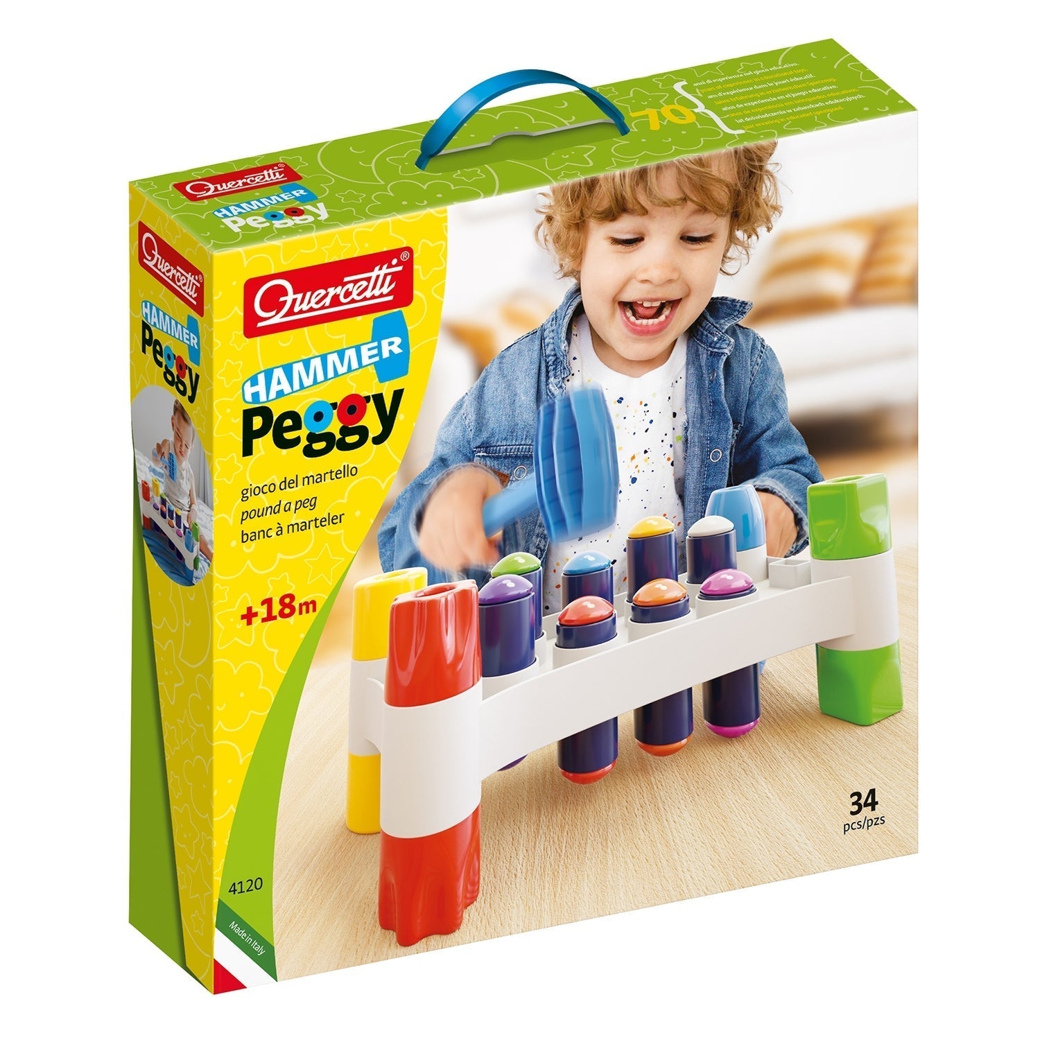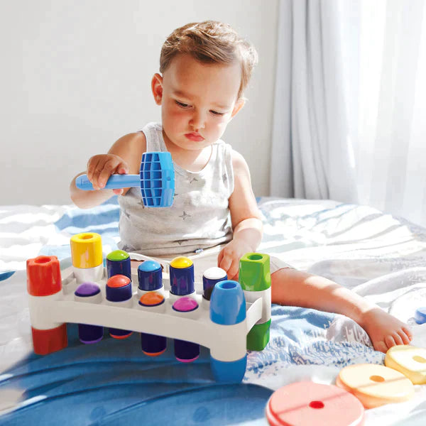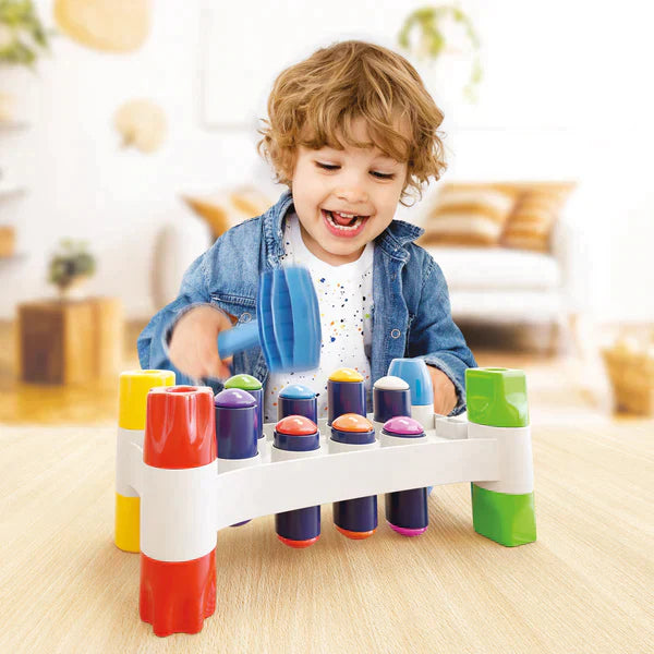 Have fun hitting the colourful pegs with the hammer and when you have finished turn the game upside down and start again.
