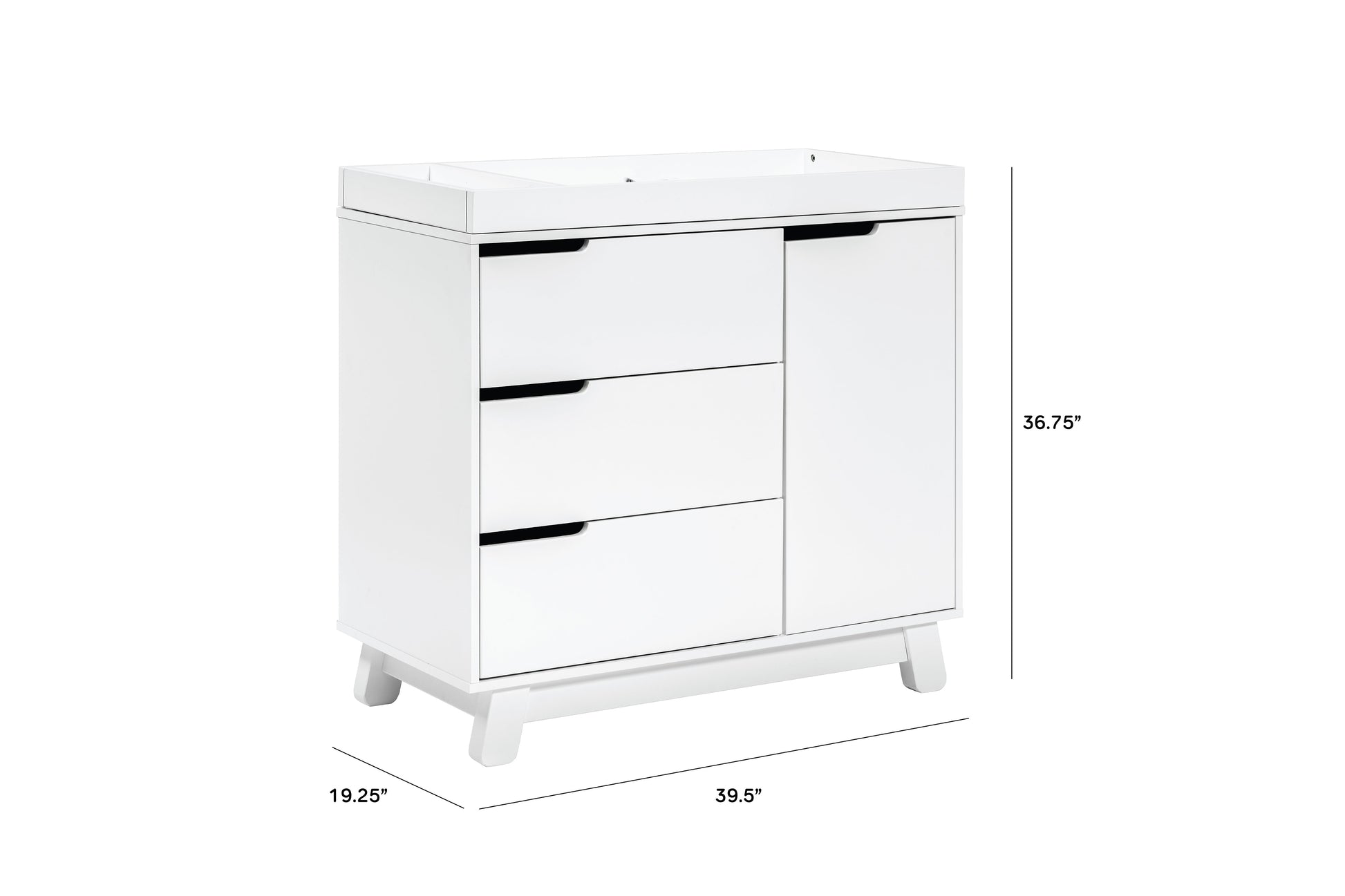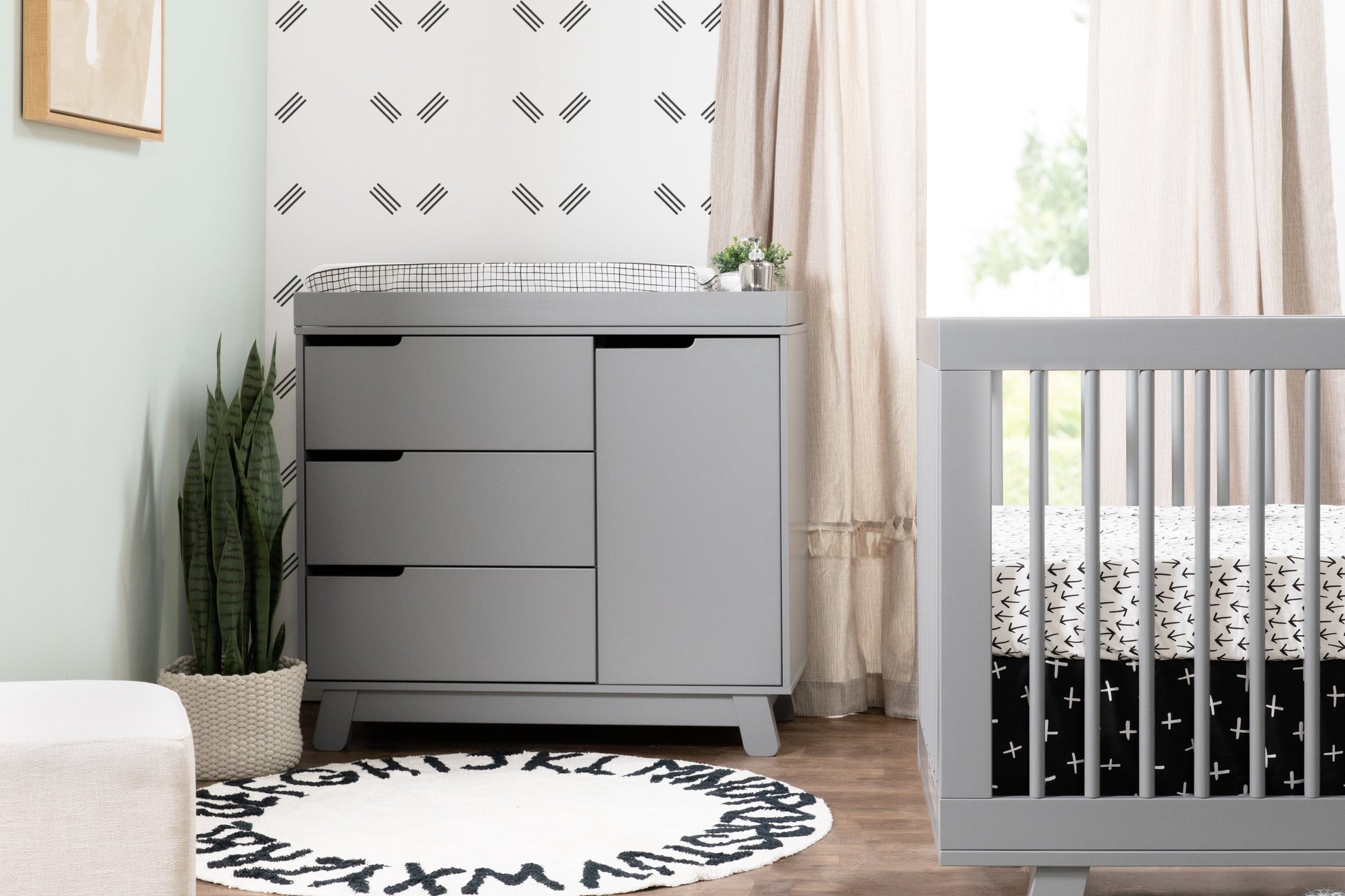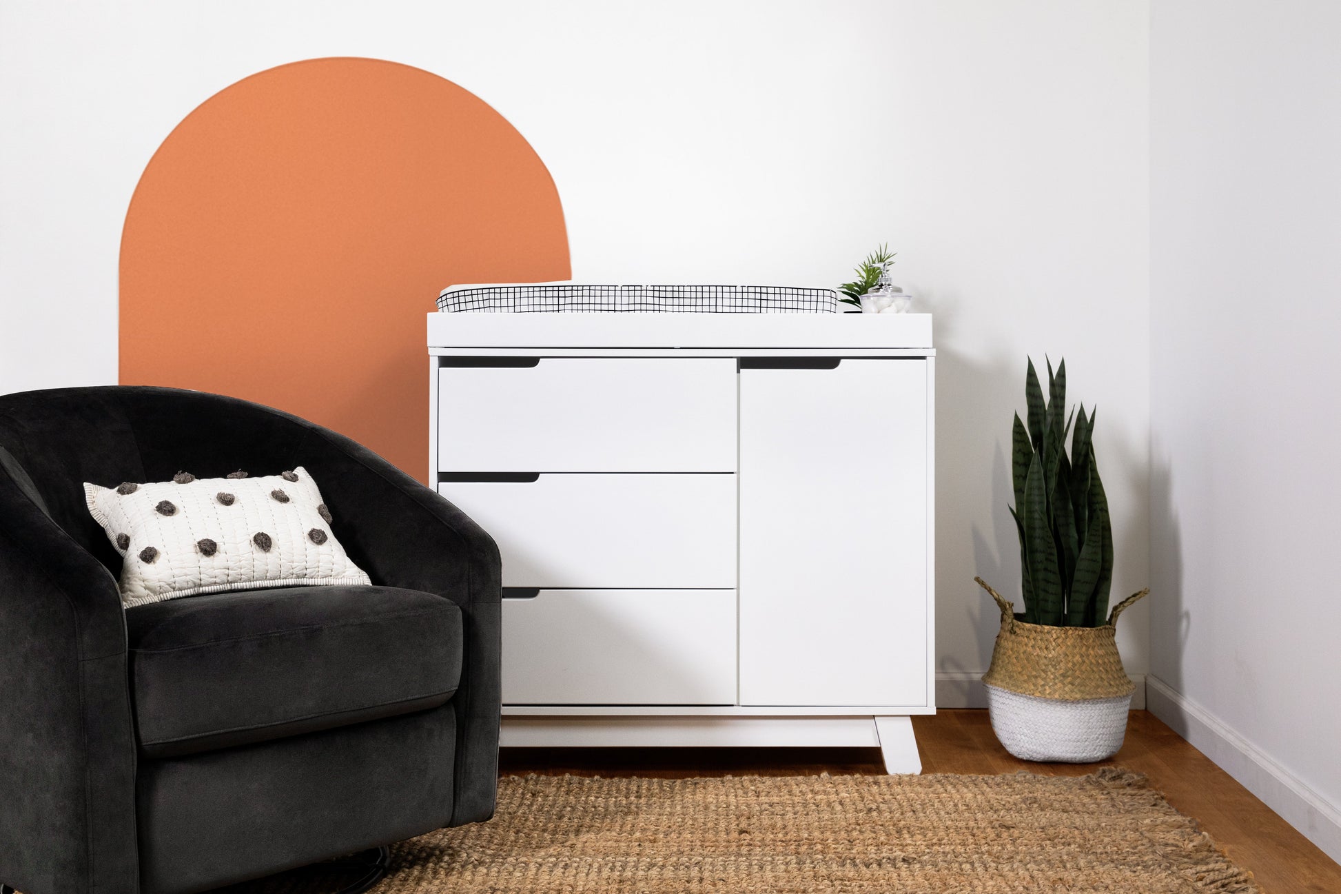 The design combines a changing table, a 3-drawer dresser, and a storage cabinet for all your necessities. The cabinet includes an adjustable inner shelf and the included changing tray can be removed, transforming it into a kid's bedroom dresser.