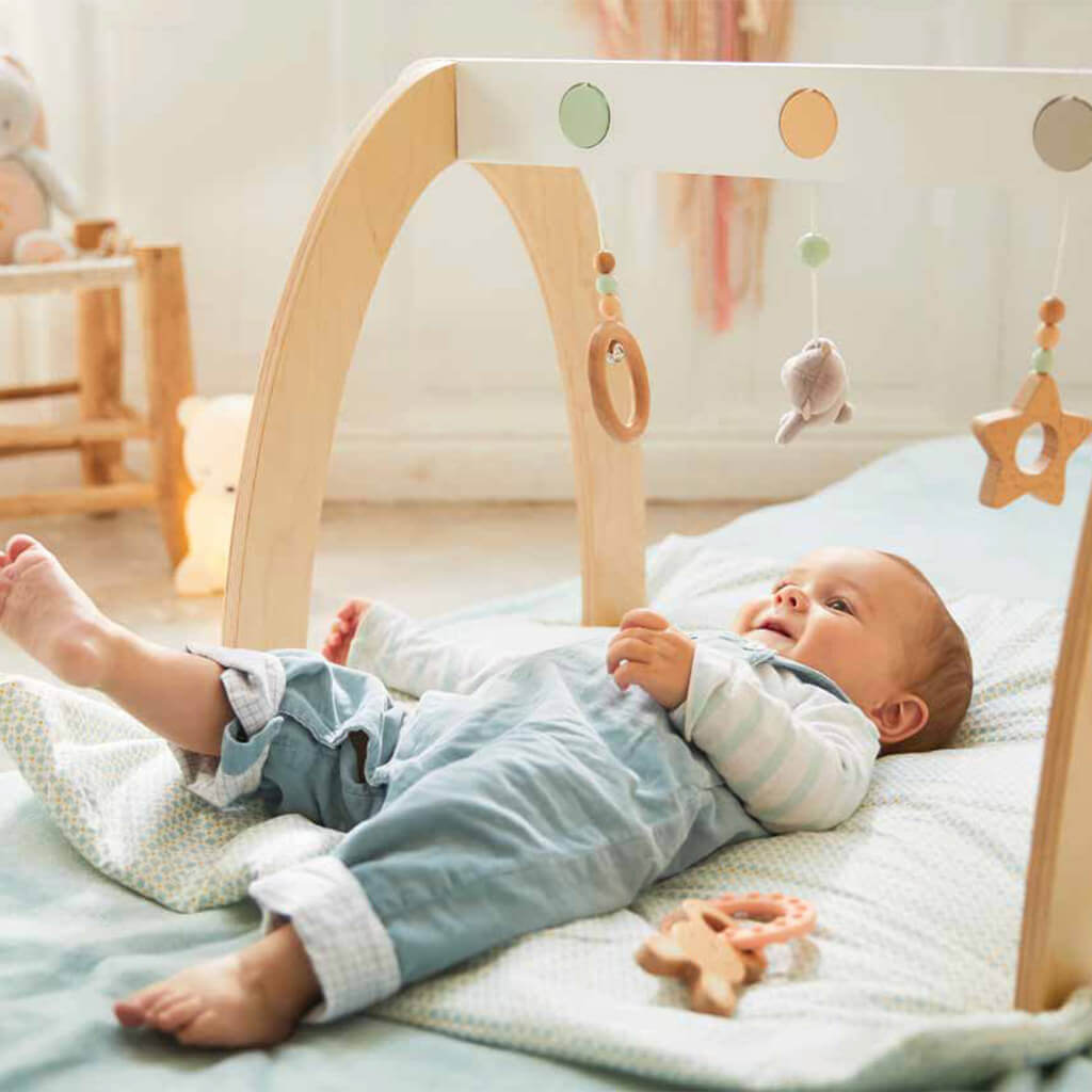 This pretty wooden frame to put on the ground is the ideal awakening companion for your baby when lying down or on their baby bouncer.