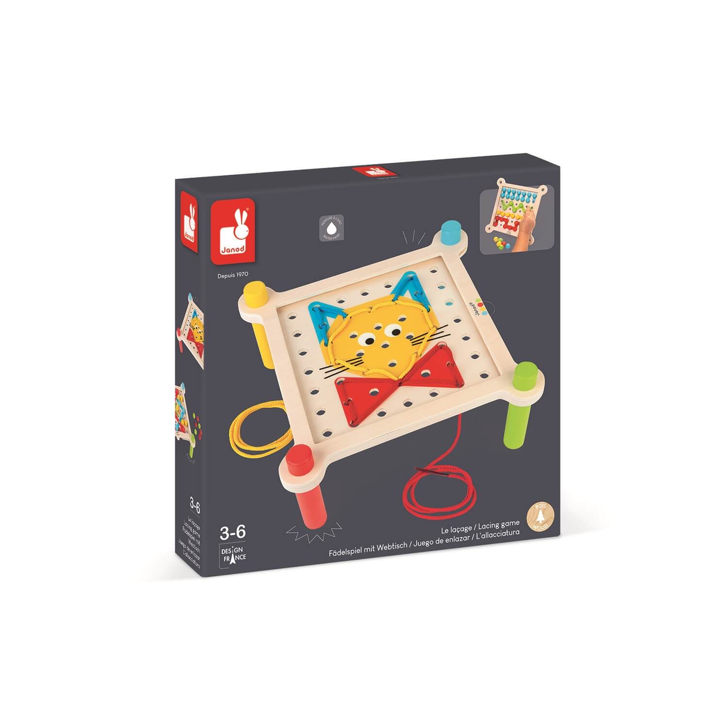 Includes 10 model cards, 70 pawns and 4 laces. This wooden awakening toy helps develop fine motor skills and concentration.
