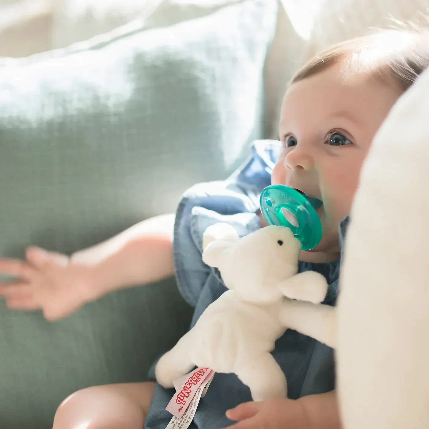 The carefully calculated weight and size of each stuffed friend keeps the pacifier positioned close to even the fussiest baby’s mouth.
