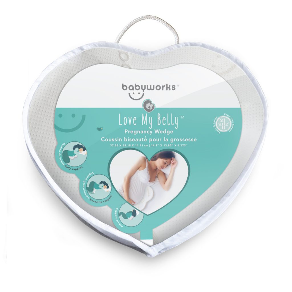 The Baby Works™ Love My Belly Wedge is a versatile pillow that women can use to help alleviate back pain that often arises during pregnancy. From belly to back to hips and knees, the Love My Belly Pregnancy Wedge features a bamboo cover which is hypoallergenic, removable, machine washable and dryer safe.