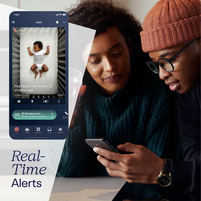Using patented computer vision technology, Nanit tracks breaths per minute (BPM) and responds quickly to changes by sending real-time alerts through the app and to the camera should your little one need you.