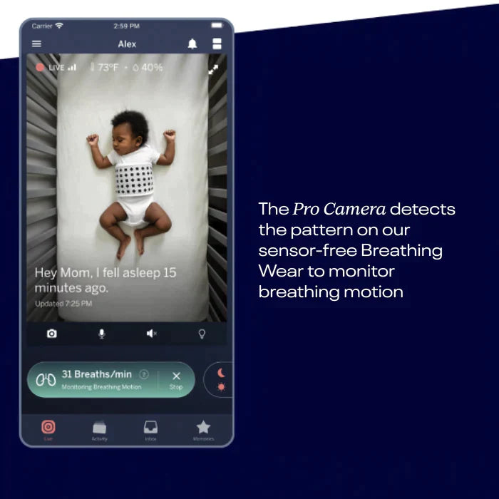 The custom-designed pattern on our Breathing Band works with the Pro Camera to safely detect your baby’s breathing motion in almost any sleep position–without sensors, electronics, or radars.