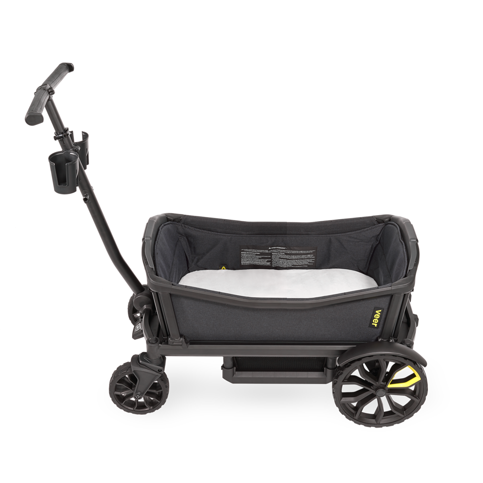The Veer Nap System turns Cruiser into a JPMA safety certified Bassinet, making it the ultimate rest stop or changing station for young ones. It is suitable from birth up to 20 lbs. [9 Kg] and/or 27” [69 cm], whichever comes first or until your infant pushes up on their hands and knees. A soft, removable mattress pad is included. The Nap System includes magnets built into its cleanable sidewalls that keep it snug to the Cruiser sidewalls, and includes four bungee connection cords that attach to the seat backs to keep little ones safe. A bug shield that zips on a sun canopy to cover the Cruiser is included (retractable sun canopy sold separately). The Veer Nap System makes a great changing station as well. The Nap System compactly folds up into a storage bag that mounts to Cruiser and it also fits in the Foldable Storage Basket when not in use.