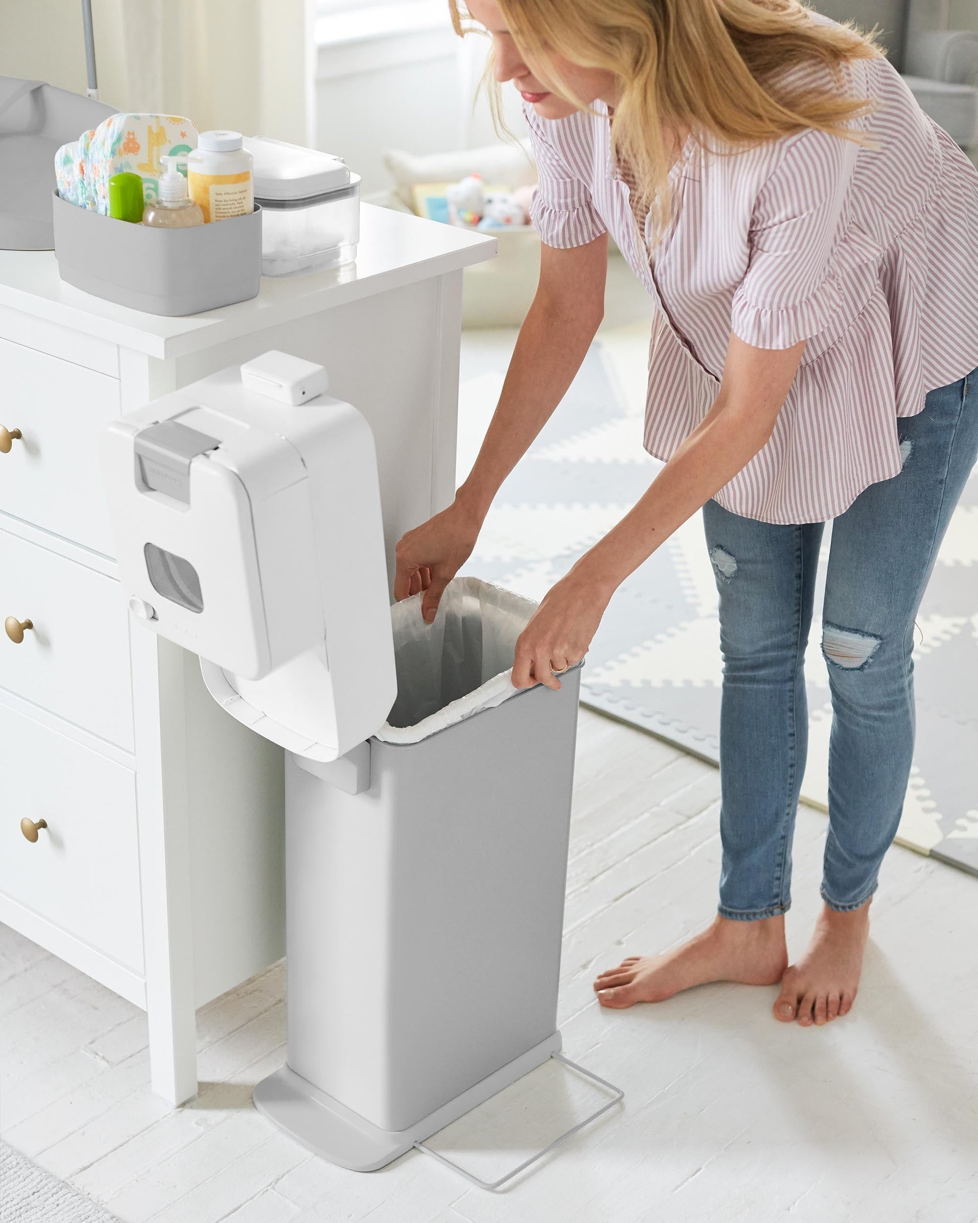 A streamlined diaper pail features an odor-resistant steel bin and dual air-lock disposal system that traps in smells so the nursery stays fresh.