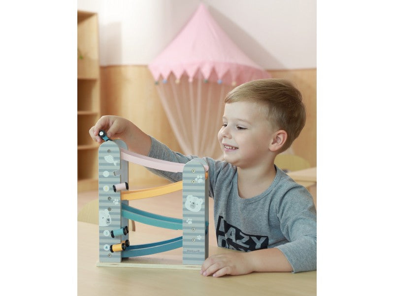 Children will love our wooden toy Car Race Slider as it's lots of fun. The slider features 4 colourful tracks in soft shades of yellow, pink, light blue and dark blue and 4 cars in the same colour scheme. Pop a car on the top track and watch it race down the track, flip over, land on the track below and keep going. The colourful Wooden Car Race Slider is similar to a marble run, only with cars.