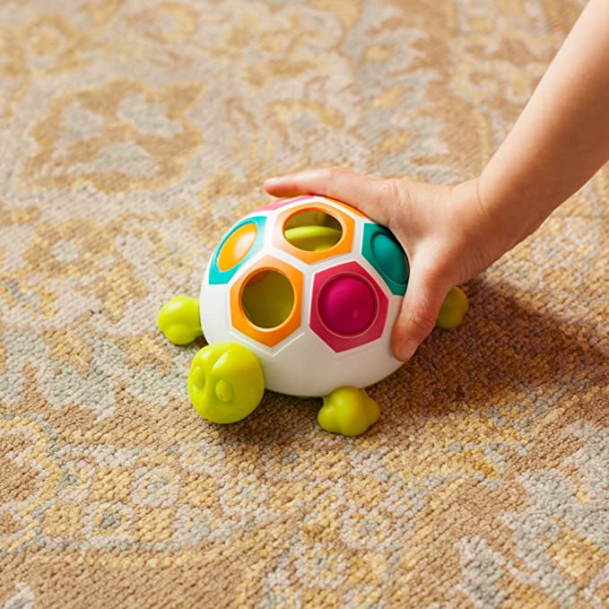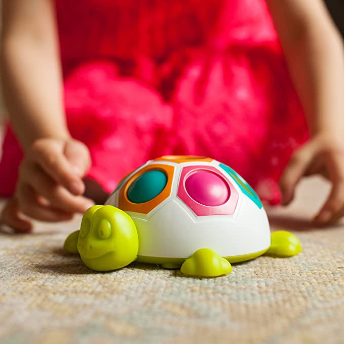 - Tactile learning toy featuring buttons that slide and pop into slots on turtle's back