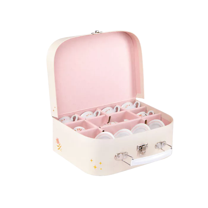 Porcelain tea set decorated with delicate pink and gold motifs, presented in a delightful illustrated box to serve the snack to his mother and her friends the little mice. Includes 1 teapot, 4 cups and 4 plates, 1 milk jug and 1 sugar bowl.
