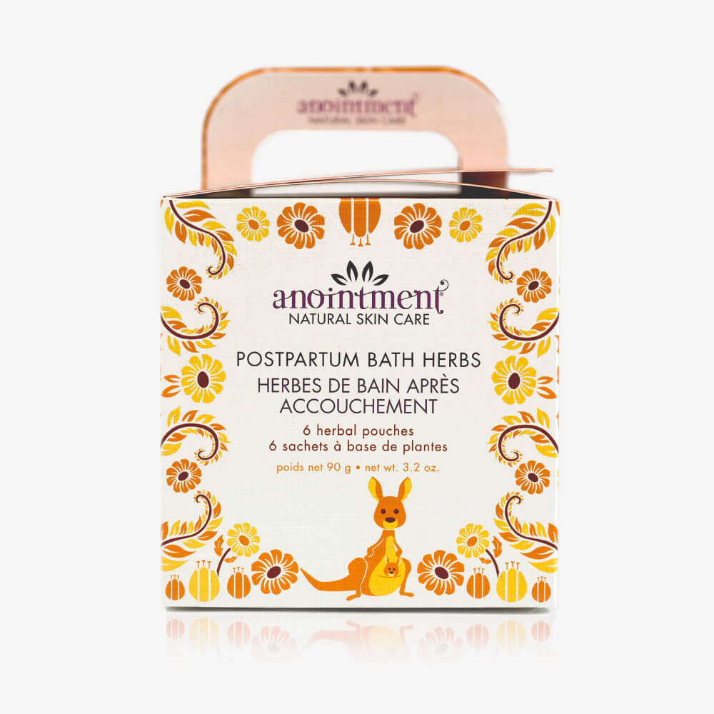 Anointment postpartum bath herbs contain a blend of sea salt and certified organic herbs traditionally used to soothe the discomforts associated with perineal swelling, hemorrhoids, episiotomy and tearing. Packaged in convenient single-use pouches – no need to wipe down the bath tub!