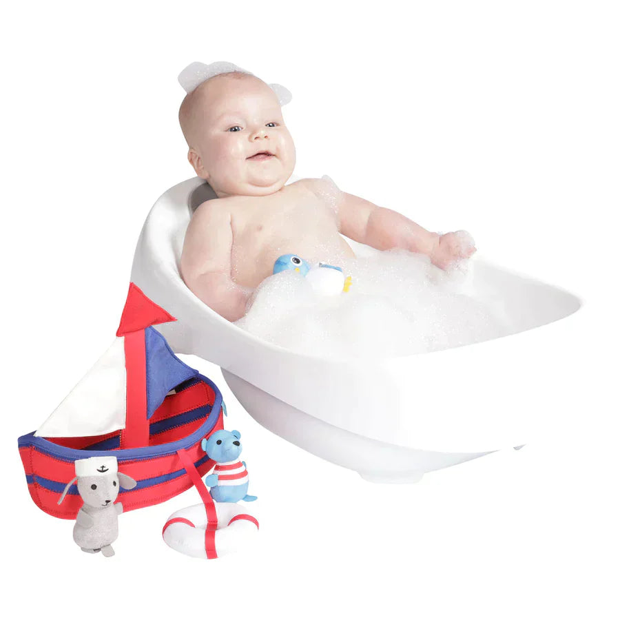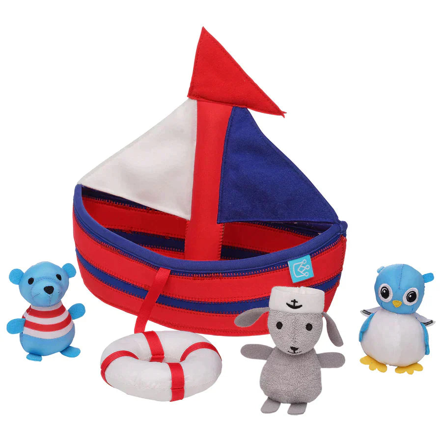 Four-piece bath-time play set includes one neoprene floating sailboat with tethered life-ring and 3 animal characters.