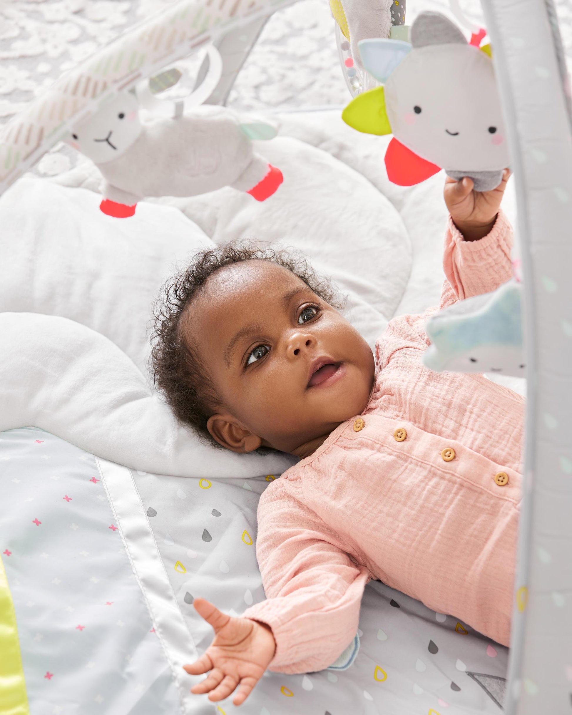 - Developmental activities include: musical sheep, light-up star, cloud squeaker with ribbons, bird rattle and sunshine baby mirror