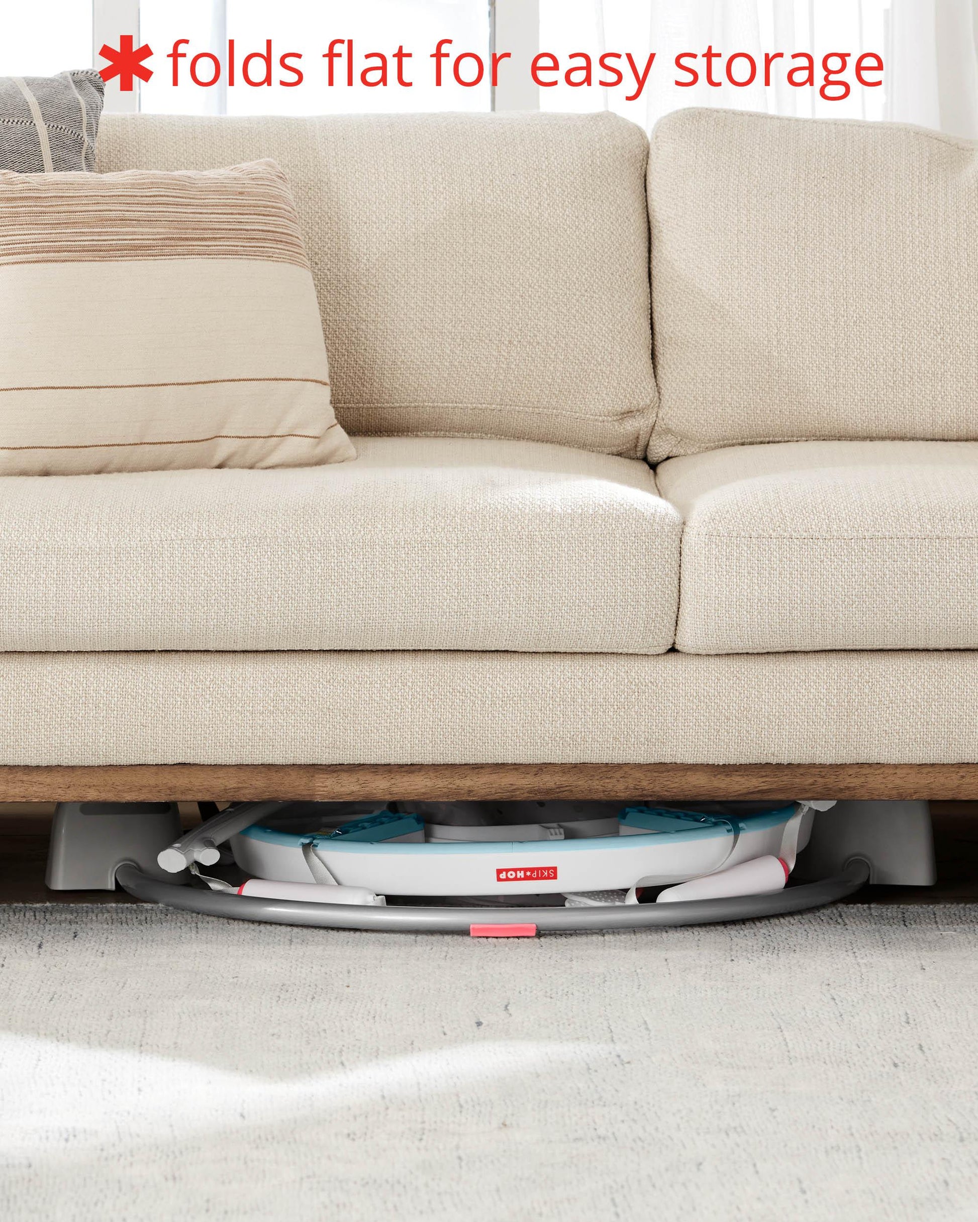 When playtime is finished, the baby jumper is easy to fold flat for storage (hide it under your couch!) and travel.