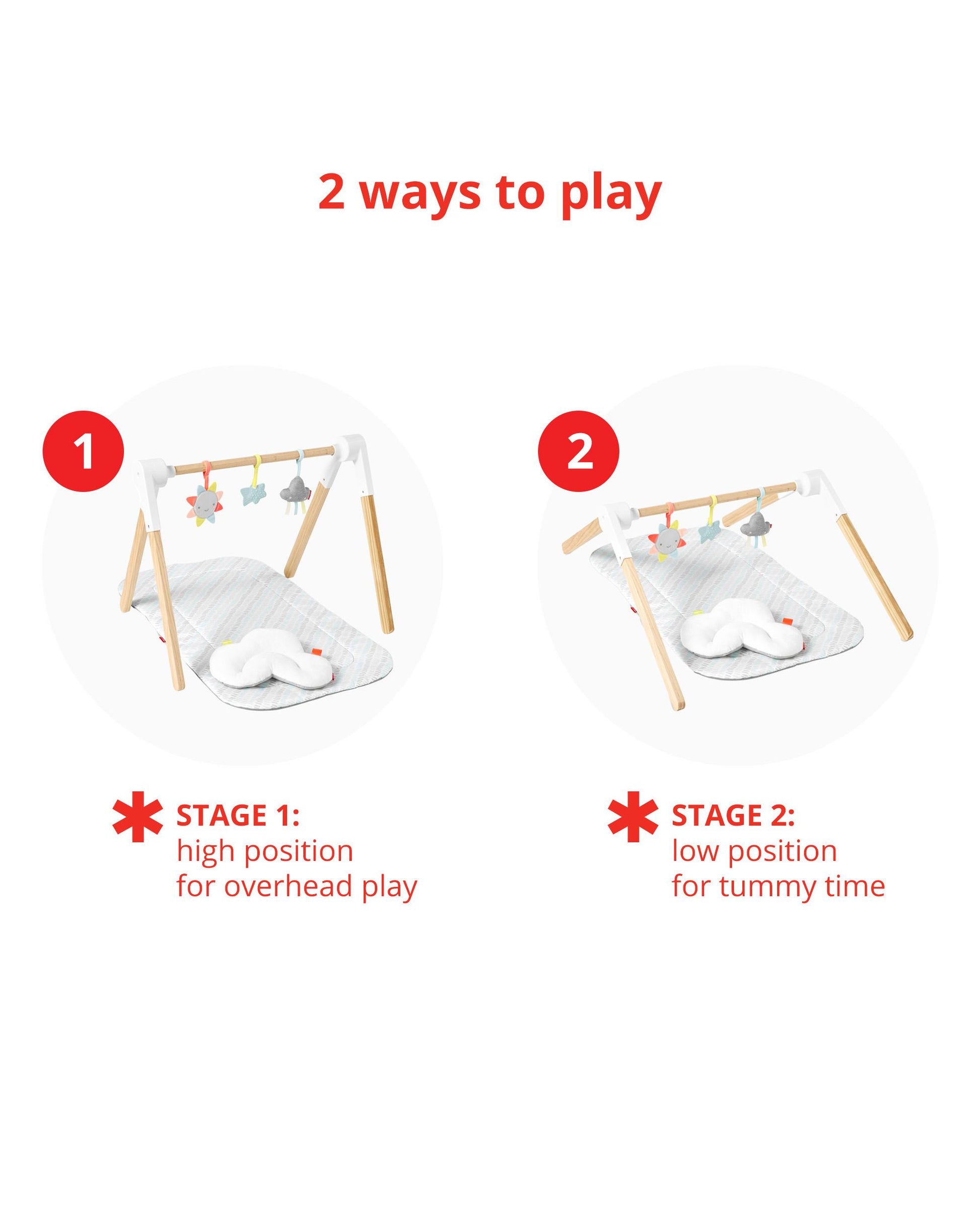 Three sweet hanging toys engage baby with texture, sounds and more, while the wooden frame adjusts for overhead or tummy time play.