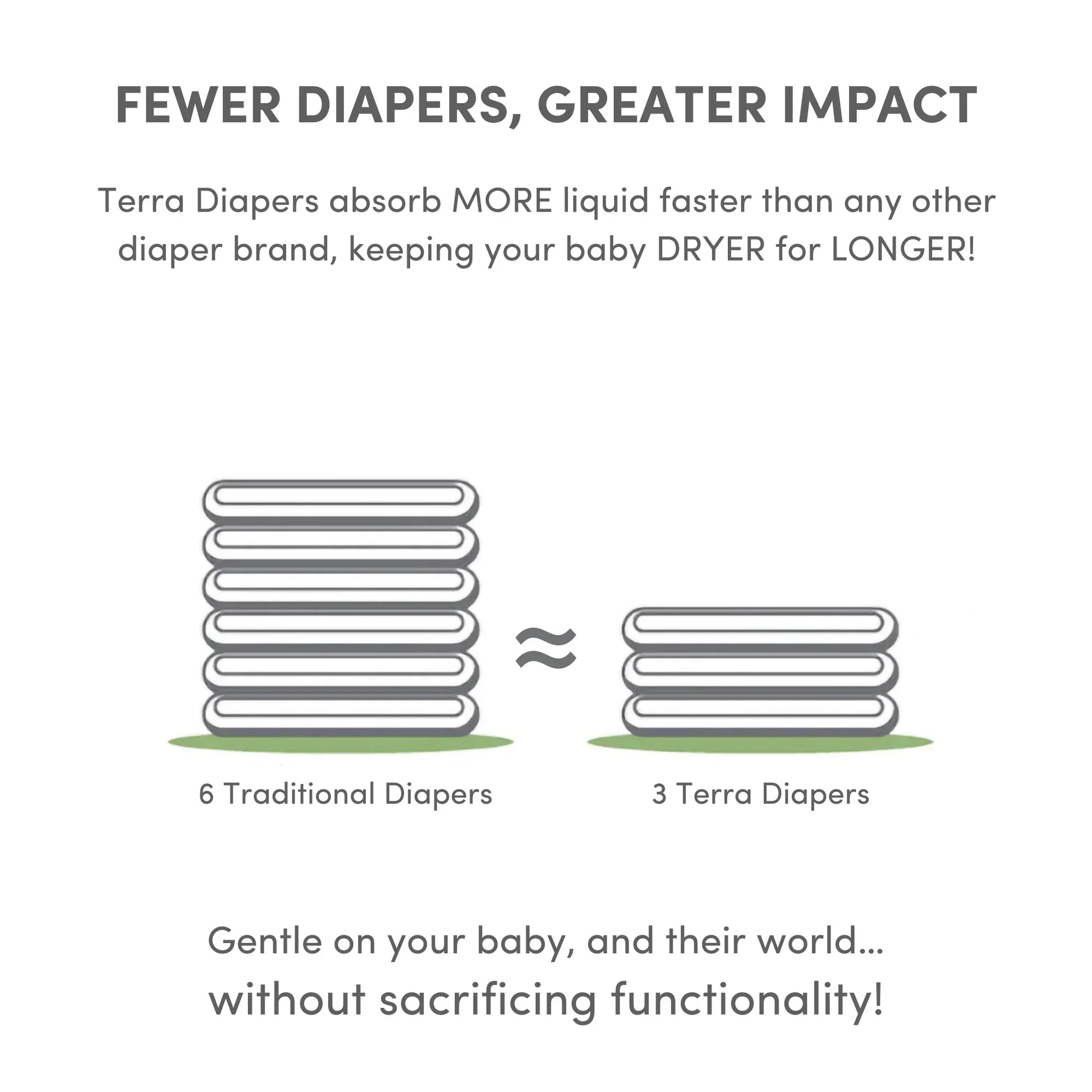 When your little one starts crawling Terra 85% Plant-Based Diapers are right there with them to protect them from leaks and wetness.