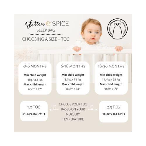 Glitter & Spice Baby Sleep Bags are available in 3 sizes and 2 Togs. A Tog is a warmth rating measurement - the higher the tog, the warmer the product. When deciding on the best tog rating to use, consider the clothes baby is wearing, and the temperature in baby's bedroom.