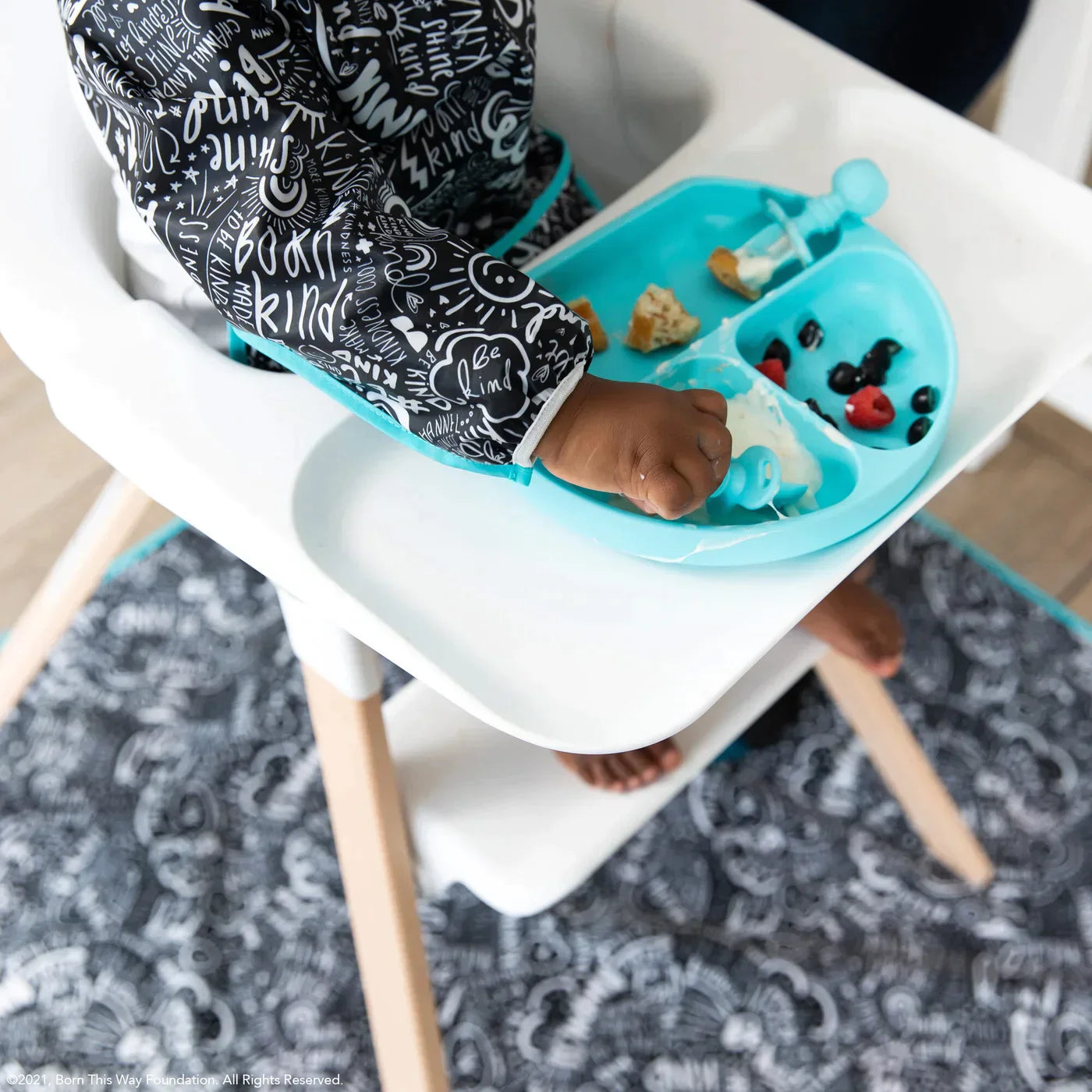 Gear up for super messes. The Sleeved Bib comes to the rescue, saving one outfit at a time with the award-winning protection of Bumkins’ lightweight, easy wipe, machine washable waterproof fabric! These generously sized bibs are both comfortable and durable, fitting babies from ages 6-24 months by adjusting sleeve length with the soft, elasticized cuff. Use the back tie closure for a secure and custom fit. With a handy, catch-all pocket for containing spills, this bib is a great addition to any mealtime! Bib measures approximately 14” across, 13” from neck down and 32” from cuff to cuff. BPA, PVC, vinyl, phthalate and lead free. Designed in Arizona, responsibly made in China.