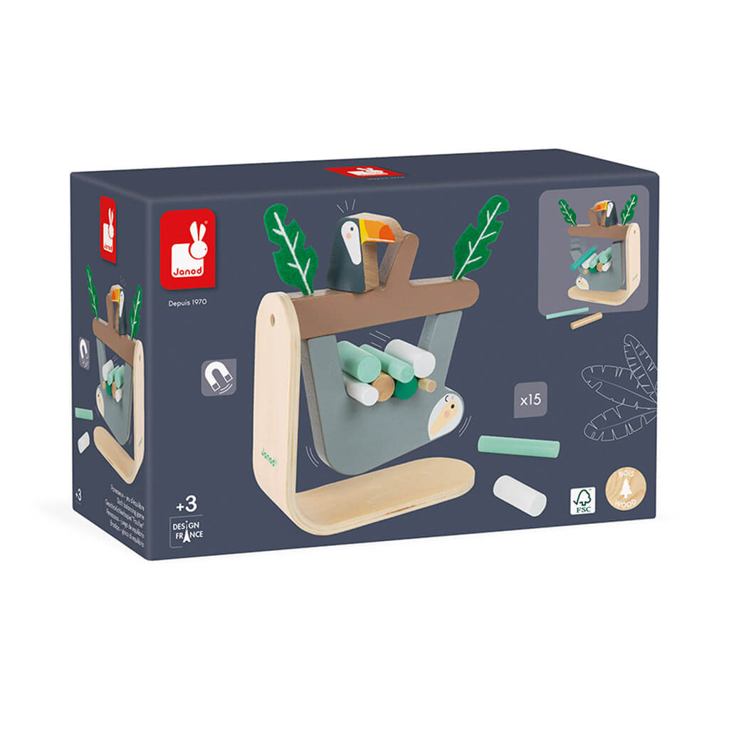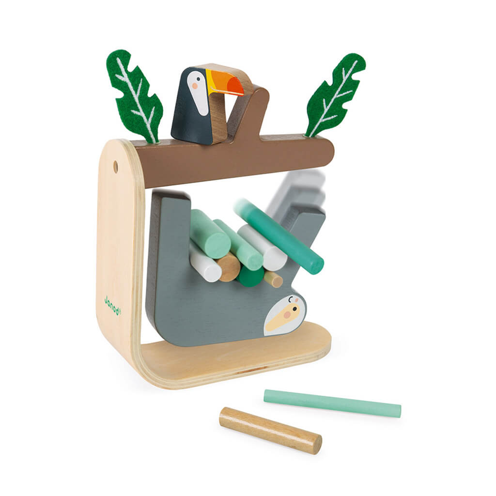 Our sloth is just taking a nap. But he’s forgotten something: it’s playtime! Rise and shine for this attractive wooden game of skill for kids aged 3 and over! This balancing game features a sloth hanging from its branch, and 15 sticks. It can be played by one or more players. The aim of the game? Put as many sticks on the sloth’s belly as you can before it lets go of the branch! The player who puts on one stick too many is the loser! Each leave in this pretty game is made of soft felt. This game is perfect for developing patience and dexterity. FSC®-certified game (wood from sustainably managed forests)
